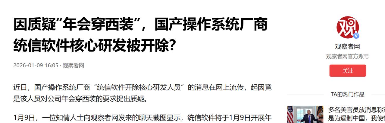吵翻天!广东深圳,统信年会西服事件越闹越大,因公司多年来第一次正式聚会,公司要求男员工统一穿西装,一位负责内核稳定性的核心研发当众反问:“这还得买西装?”结果被董事长当场开除。而网友们则是看法不一。 事情的起因很简单,统信软件准备举办一场年会,而且明确这是公司多年来第一次正式聚会,所以对参会着装提了要求,具体要求其实不算苛刻,就是男员工穿深色西服搭配浅色衬衫,再配一条深色西裤就行,既没限制西装品牌,也没对鞋子做额外规定。可就是这样一条看似常规的通知,在公司的年会群里掀起了波澜。 群里一位名叫黄某的技术骨干,也是负责公司内核稳定性工作的核心研发人员,看到通知后直接抛出了一句疑问,核心意思就是参加个年会难道还得专门买西装。 就这一句简单的质疑,没成想直接引来董事长的强硬回应,而且回复简短又决绝,当场表示要把他开除,好好的年会通知群,瞬间变成了冲突现场,这突如其来的处理方式,让群里所有人都始料未及,也让这场着装风波彻底发酵。 了解科技公司的人都知道,研发部门的工作氛围向来随性,着装更是怎么舒服怎么来,很多技术人员穿着拖鞋、短裤就能对着代码敲一整天,这在行业里早就不是新鲜事。 对他们来说工作效率永远是第一位的,着装这种形式化的东西根本不重要,舒适的穿着才能让他们更好地投入研发,也正因为如此,统信这次突然拔高规格的着装要求,对习惯了宽松氛围的技术团队来说,确实是个不小的认知冲击。 不少人完全能理解黄某的疑问,毕竟很多研发人员的衣柜里可能根本没有西装,平时也没机会穿,为了一场内部聚会专门花钱买一套大概率只穿一次的西装,确实让人觉得没必要。 但也有人觉得黄某作为公司的核心研发人员,在几百人的年会大群里公开质疑公司决策,确实不妥当,成年人遇到着装这种小问题,完全可以私下找HR或者领导沟通解决,真不想买也能借一套,没必要在大群里公开抱怨,这传递的是不配合公司安排的态度,很容易破坏团队氛围。 网上的争论更是激烈,双方各执一词,吵得不可开交。支持公司开除决定的网友认为,问题的关键从来不是西装本身,而是员工的职业态度,公开场合质疑公司合理安排,就是不服从管理,公司开除他是为了维护规则没什么问题,要是这次纵容了这种公开叫板的行为,以后其他员工也跟着学,公司的管理就没法开展了。 但反对的声音明显更多,大部分网友都觉得董事长的反应太过激了,黄某只是提出了一个不算过分的疑问,又不是故意对抗公司,作为领导完全有更温和的处理方式。 比如耐心解释一下这次年会正式举办的意义,说明统一着装是为了展示团队形象、增强凝聚力,要是员工有购买西装的经济压力或者其他难处,也可以协商解决,没必要一上来就用开除这种极端方式。 大家普遍觉得,一个掌握公司核心技术的研发人员,就因为这么一句疑问就被当场辞退,实在太可惜了,公司这么做不仅损失了宝贵的人才,还会让其他员工产生寒蝉效应,以后谁还敢主动提问题、说想法?只会让员工变得小心翼翼,对公司的归属感也会大大降低。 最让人惋惜的是,从提出着装要求到员工面临失业风险,中间几乎没有任何缓冲和沟通的地带,黄某用最直白的方式表达了自己的困惑,付出的代价却是职业稳定性,公司用最极端的方式维护了所谓的规则,代价却是企业形象受损和员工信任的流失。 现在全网都在讨论这场风波,反而没人关注年会本身了。说到底,这是一场双输的结局,原本只是一件小事,却因为处理方式的不当,闹到无法收场的地步,实在值得所有企业和职场人深思。