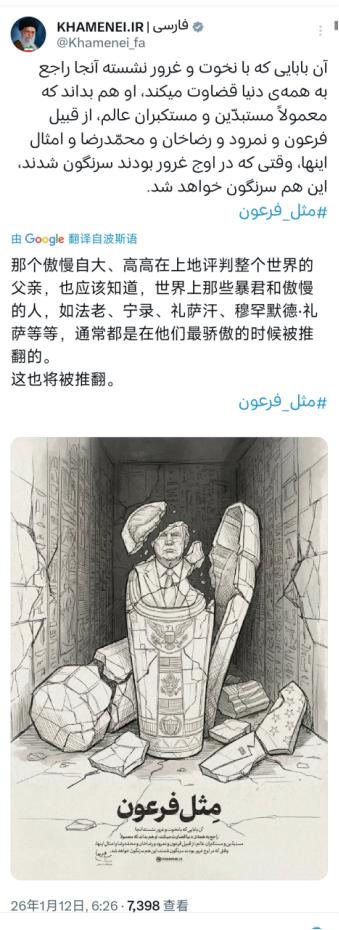 伊朗最高领袖哈梅内伊北京时间1月12日写道:“那个趾高气扬、自以为了不起地评判整个世界的家伙,应该明白像法老、尼罗德、礼萨汗、穆罕默德·礼萨以及其他那些暴君,在其极度狂妄之时都被推翻了。这个人也会如此。”哈梅内伊发布的图片展示了一尊破损的特朗普雕像位于一座埃及古墓中。 哈梅内伊敢说这种狠话,说白了就是被逼得没办法了。这与其说是威慑对手,不如说是给国内打气,稳住眼下的局面。现在的伊朗,早就没能力硬气对抗外部压力了。 内忧外患缠在一起,日子过得紧巴巴的。国内这边,物价一个劲涨,货币贬得不成样子。去年年底就因为这些民生问题,爆发了大规模示威,还蔓延到了好几个城市,造成了人员伤亡。 老百姓手里的钱越来越不值钱,1美元能兑换大概140万里亚尔。像德黑兰大学教授这样的中产,工资实际能买到的东西,也就相当于三千多人民币。底层民众的日子就更没法过了,抗议者喊着“面包、工作、自由”的口号,把所有经济压力都变成了对现状的不满。 为了应付财政困难,伊朗政府搞起了“减补贴、增税收”的法子。可这招非但没解决问题,反而成了引发示威的导火索。能源出口被制裁卡着脖子,国家收入大幅缩水。但军事重建、日常运转都得花钱,只能在民生预算里抠。 不仅减少了燃料和食品补贴,还提高了企业所得税和进出口关税。这一下就把商人、农民、学生等各个群体的不满都点燃了。更麻烦的是,政府内部意见还不统一。 总统佩泽希齐扬想靠温和的办法安抚民众,修改预算、发购物券补贴大家。可强硬派却一个劲弹压抗议人群,把所有问题都推给外部势力。两边互相拉扯,出台的应对措施根本落不了地,局势越拖越糟。 哈梅内伊9号就急着发表电视讲话呼吁团结,其实就是怕内部乱局控制不住。这会儿拿特朗普开骂,也是想转移大家的注意力,勉强凝聚点国内共识。 外部的压力更是一步步紧逼过来,特朗普根本没把这波嘲讽当回事。他反而在琢磨,怎么进一步干涉伊朗的局势。有消息说,特朗普正在考虑一堆强硬手段,包括向中东派航母战斗群、发动网络攻击,甚至直接开展军事打击。 他还计划召集高级官员开会,把这些方案敲定。嘴上说着伊朗提议谈判,却放话可能会“先行动”。更要命的是,美国在中东的军力一直在加码。从去年5月到现在,已经增兵2万人,五代战机、反导系统也都部署到位了。 单在伊拉克和科威特,就有上万驻军。再看伊朗,军力排名连埃及都比不上,军费还不到美国的一个零头。主战坦克、战术飞机的数量,更是连美国的零头都够不着。双方的实力,根本就不在一个档次上。 伊朗手里那点能拿得出手的筹码,其实根本经不起推敲。所谓能封锁霍尔木兹海峡、靠反舰导弹威慑美国航母,听着挺唬人。 可真要是动起手来,顶多只能给美国造成点麻烦,根本改变不了战局走向。美国心里也清楚这一点,所以才敢频频放狠话,甚至不排除复制突袭委内瑞拉的模式,对伊朗动手。 更雪上加霜的是,以色列还在旁边虎视眈眈。总理内塔尼亚胡为了连任,正想靠对伊朗示强刷政治筹码。他说不定就会趁机打击伊朗的核设施,之前双方就爆发过“十二日战争”。现在局势这么紧张,冲突随时都可能再次升级。 再说说伊核问题,这本来是伊朗和西方博弈的重要筹码,现在却陷入了死局。重返核协议的前景很黯淡,相关的限制条款也已经失效。伊朗和西方彻底走向了对抗,美国的制裁还在一层层加码。 伊朗想靠核技术争取谈判筹码,结果反而引来更多封锁和打压。伊朗总统说,美国、以色列和欧洲在对伊朗发动“全面战争”。这话虽然有点夸张,但也不算完全离谱。 经济上被制裁,安全上被围堵,内部还乱作一团。三重压力叠加之下,伊朗的政策空间被挤得越来越小。它连自保都得拼尽全力,根本没有资本和美国硬刚。 哈梅内伊拿历史上的暴君类比特朗普,无非是想借历史说事儿给自己壮胆,暗示霸权总有一天会覆灭。可历史从来都是靠实力说话的,那些被推翻的暴君,要么是内部矛盾彻底爆发,要么是遇到了更强的力量制衡。 现在的伊朗,既没有足够实力对抗美国的施压,也没能解决好国内的根本问题。民众想要的是面包和工作,不是空洞的口号和犀利的嘲讽。外部的威胁,也不会因为几句狠话就消失不见。 特朗普就算再狂妄,背后也有美国的军力和经济实力撑着。哈梅内伊的狠话越狠,就越能反衬出伊朗当下的窘迫处境。 说白了,没有硬实力做支撑,再尖刻的嘲讽也只是自我安慰的空话。伊朗现在最该解决的,是国内的经济民生乱象,是怎么打破外部的制裁封锁。而不是靠发几张图片、说几句狠话发泄情绪。 如果不能尽快拿出实实在在的解决方案,稳住内部局面、慢慢积累实力,再响亮的口号也挡不住内忧外患的侵蚀。