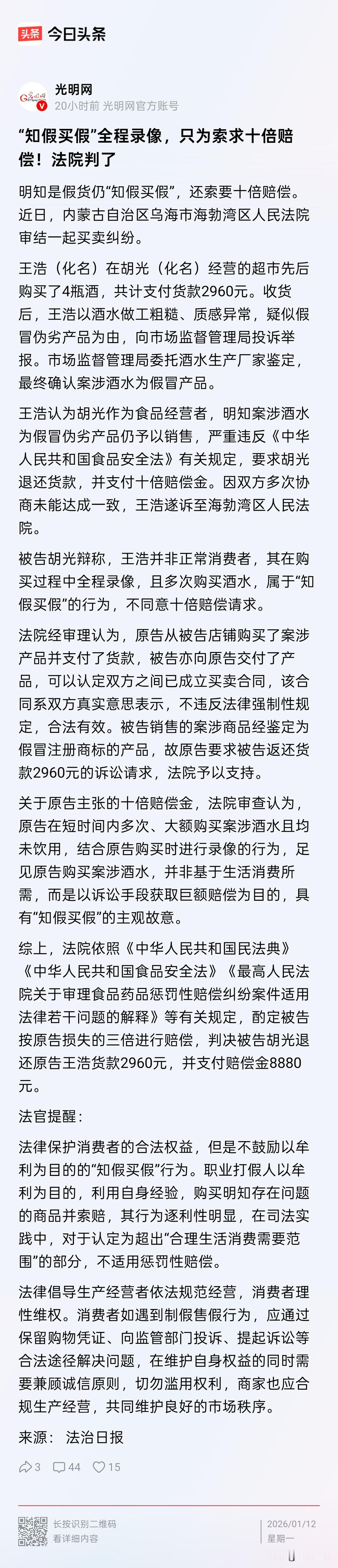 “知假买假,过分吗?”内蒙古乌海,一男子拿着录像机来到一家超市,花2960元购买了4瓶某品牌的酒水。而后,男子以该酒水有问题为由,向市监局举报。经市监局鉴定确认为假酒后,男子拿着全程录像,一纸诉状将超市老板告上法院要求“退一赔十”,法院这样判了。 据环球网报道,事发当天,男子王某拿着录像设备,来到胡某经营的超市,先后买了4瓶酒,共花费2960元。 收货后,王某以酒水做工粗糙、质感异常为由,向市场监管局投诉举报。经酒水生产厂家鉴定,这4瓶酒确为假冒产品。 换作普通消费者,买到了假货,肯定会要求老板退货赔钱,这也合情合理。 可王某的要求却很“硬核”:不仅要退还2960元货款,还要求胡某按《食品安全法》支付10倍赔偿金,也就是29600元。 超市老板胡某见状,觉得王某这是在讹诈,当场拒绝了。 王某倒也不再啰嗦,转头就将胡某告上了法院。 对于王某的起诉,胡某坚持辩解到,王某在购买时全程录像,还多次大额采购,这根本就不是正常消费行为,分明就是“知假买假”,意图牟利。 一方是真的有售假行为,一方则“知假买假”,法院会支持哪一方呢? 首先,《食品安全法》确实有“退一赔十”的条款和规定,目的是为了打击制假售假行为,从而保护为生活消费买单的普通消费者。 但相关司法解释也明确了:如果购买者明知是假货还刻意购买,目的是靠诉讼赚取巨额赔偿,那么,这样的行为就超出合理消费范畴,对于超额索赔,法院是不会支持的。 对于本案而言,法院经审理后认定,王某确实存在着短时间内多次、大额买酒,且全程录像留证的行为,足以证明他并不是为了生活消费,而是冲着赔偿金来的,主观上就是“知假买假”。 不过,胡某经营的超市,也确实存在卖假酒的行为,违反了经营者的基本义务,王某退款诉求理应支持。 最终,法院综合全案判决,胡某应退还王某货款2960元;因王某构成“知假买假”,其主张的10倍赔偿诉求不予支持。 但鉴于胡某的确存在着过错,故酌定其向王某支付三倍赔偿金合计8880元为宜。 常言道,食品安全大于天,任何有违食品安全的行为和个人,都将因此付出应有的代价。这也是《食品安全法》对违反食品安全行为予以重惩的原因所在。 当然,对消费者来说,维权无可厚非,但也切勿把维权当成发财路。 对此,你怎么看呢?欢迎大家在评论区留言。(注:图片仅供示意)