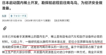 日本态度已明,不会指望中国,日本国内有动作了!高市早苗公开抗议中国的管制行为只针对日本之后,对此日本已经有行动了,12日上午,一艘日本研究船从静冈市清水港出发,前往小笠原群岛南鸟岛附近海域勘探含稀土泥矿。 可更关键的是,“海底宝藏” 没那么好挖。南鸟岛周边稀土储量虽有 680 万吨以上,却藏在海面下 5500 米深处。这次勘探要用 “扬泥管” 抽吸泥浆,每吨仅能提取 2 公斤稀土。日本曾在 2500 米深海试过水,5500 米深度水压高达 550 个大气压,成功率没人敢打包票,纯属碰运气。 殊不知,1 月 11 日,美国务院亚太事务助理国务卿访日,主动提 “稀土合作”。明着是帮日本,实则想插一脚 —— 美国加州芒廷帕斯矿 80% 产量都送中国加工,自己没提炼能力,想借日本的矿、中国的技术搞 “两头通吃”,算盘打得噼啪响。 与此同时,澳大利亚曾跟日本合作开发稀土矿,结果因成本太高烂尾;越南、加拿大也在抢稀土市场,根本没把日本放眼里。新加坡《联合早报》直言,日本深海开采至少要等 10 年,这期间还得求中国。中国稀土协会 1 月 12 日透露,对日出口仍正常,只是加强审查,太淡定。 不过,日本的 “扬泥管” 得从英国进口,之前就因交付延迟拖了两年。提炼稀土更依赖中国专利,中国光相关专利就有 2.5 万项,日本连零头都不到。就算挖上来泥浆,也得运到马来西亚加工,绕来绕去还是省不了事,这硬气太假了,装出来的。 此外,2010 年中方限制稀土出口,日本闹着找替代,结果 5 年后进口依赖度反而从 60% 涨到 70%。如今重走老路,却碰上中国全产业链把控,从采矿到回收全占优。这就像想造汽车却没发动机,光有铁矿没用,白忙活一场,纯属瞎折腾。 深一层看,日本跟着美国“反华”,1 月 9 日还拉 G7 告洋状求支持,却砸了自己的经济饭碗。高市早苗骂完中国就派船,看似强硬,实则是给国内企业演戏。美国只顾自己利益,不太可能真心帮日本,最后很可能赔了夫人又折兵,太不值。 说到底,日本的反击是 “虚张声势”。不是不想硬气,是实力不允许。 以上是小编个人看法,如果您也认同,麻烦点赞支持!有更好的见解也欢迎在评论区留言,方便大家一同探讨。
