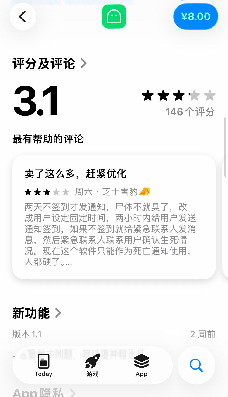 “死了么App”才火两天,就已经出现盗版了。目前在iOS应用商店,搜索“死了么”会自动提示“死了么 - 最新版”,然而正版的名字是“死了么 - 官方正版”,关键是盗版只要6块钱,比正版便宜2块钱。AppStore的防盗版措施还是一如既往的稀烂,两款APP名字主体一样都能上架。30%的苹果税收了,却完全没有给创作者提供任何保护。但即使如此,“死了App”依旧只提供iOS版本。 不过“死了么app”的评价也从前几天的3.8分,一路下滑到了3.1分,似乎大部分用户对这款App的功能并不满意。最新的留言是“卖了这么多,赶紧优化。”