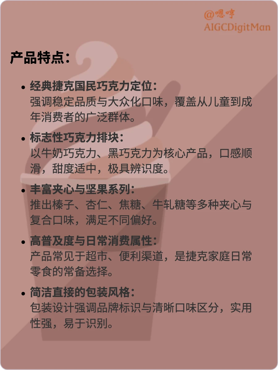 经典捷克国民巧克力定位: 强调稳定品质与大众化口味,覆盖从儿童到成年消费者的广泛群体。