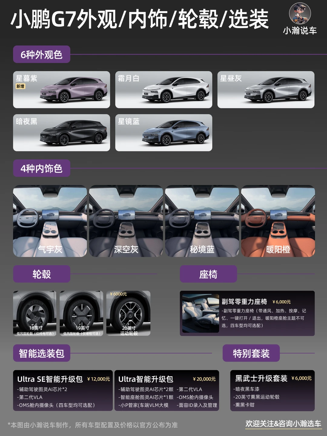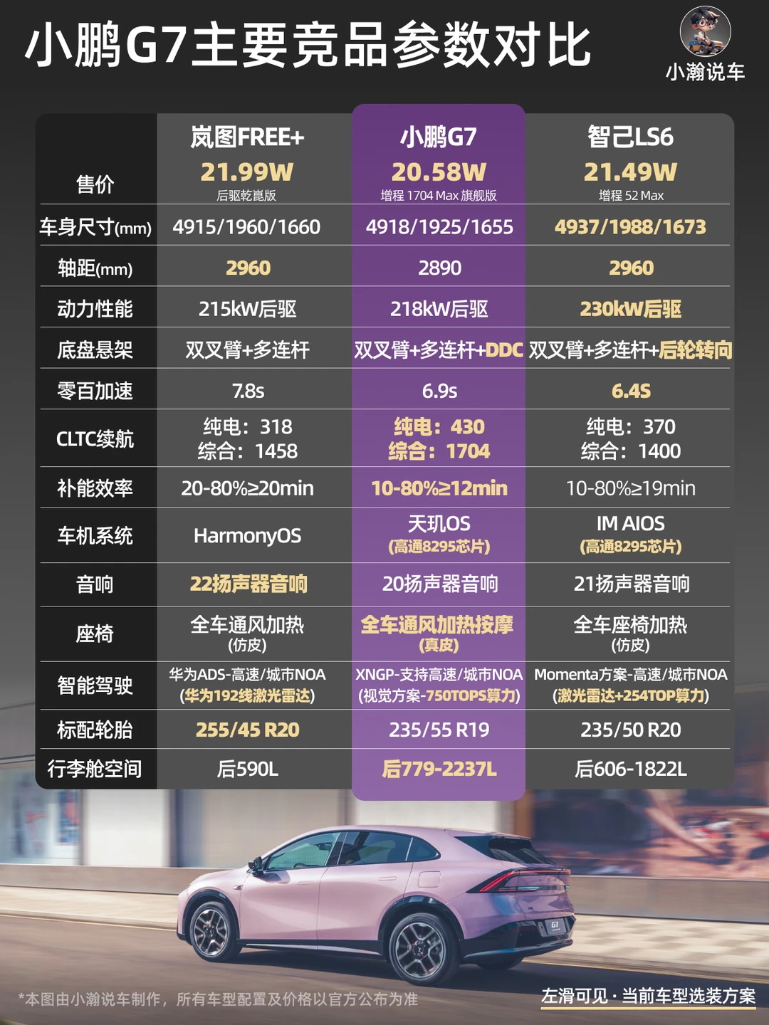 虽然也是“大电池+小油箱”的新一代混动方案,但相比P7+在20万以内“独一份”,G7作为SUV面临的竞争显然要更激烈。在“免购置税”的25年,智己等品牌在同价位已经推出过纯电续航400km+的增程产品。26年接下来,理想、小米等品牌也基本确定会推出“大电池+小油箱”的改款产品或新产品。故小瀚建议,如果是春节前一定要买这个定位车,可以趁着有8千元购车补贴入手G7。不然,可以等其他品牌的产品上市,甚至等小鹏接下来会推出的“更具性价比”的G6增程版!