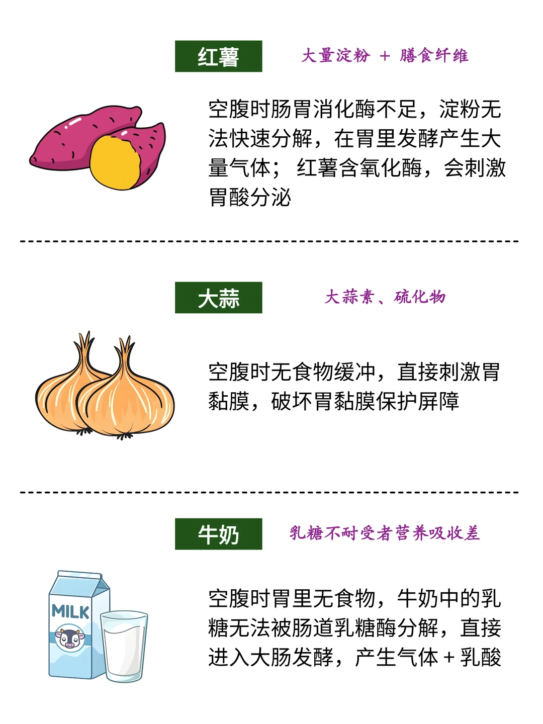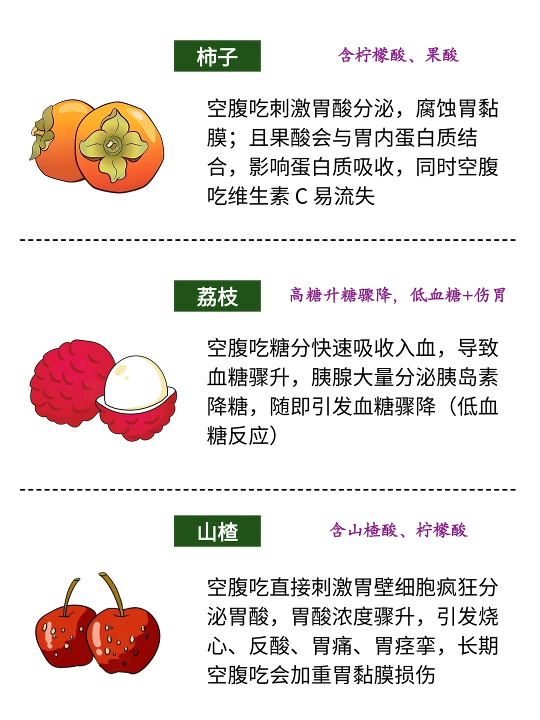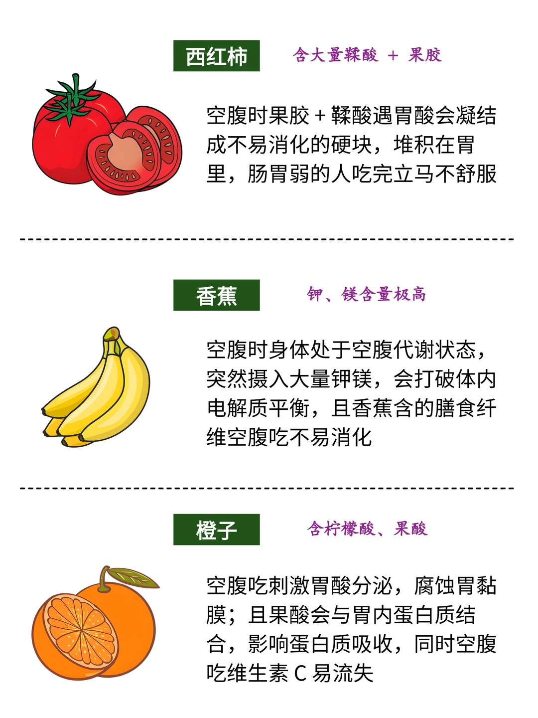 宝子们!是不是经常饿了就随手抓点东西吃? 其实很多常见食物空腹吃超伤胃轻则胀气反酸,重则可能引发不适! 整理了[九R]种空腹要避开的食物,赶紧码住记好~ 1⃣️西红柿 含鞣酸➕果胶,空腹遇胃酸形成硬块,易胃胀恶心,严重可能长胃结🪨 2⃣️柿子 鞣酸果胶含量高,空腹易形成胃柿🪨,引发剧痛呕吐,超难受 3⃣️香蕉 钾K镁Mg含量高,空腹过量吃加重↑心脏负担,还易腹胀 4⃣️荔枝 高糖!空腹吃血糖骤升骤降↓,易引发头晕心慌的荔枝病, 还会上🔥 5️⃣橙子 酸度足!刺激胃黏膜,易反酸烧心,长期伤胃黏膜 6⃣️山楂 超酸!刺激胃黏膜→促胃酸分泌,胃炎胃溃疡宝子必避,会加重不适 7⃣️红薯 含气化酶,空腹吃产气多易胀肚打嗝!还会刺激胃酸,引发反酸烧心🤮 8⃣️大蒜 大蒜素超刺激,空腹吃破坏胃黏膜,胃里🌶️火辣辣还反酸,增加胃病风险 9⃣️牛奶 空腹难吸收!蛋白质易凝固致腹胀腹泻,乳糖不耐 受更要注意~ 喝前建议垫点主食