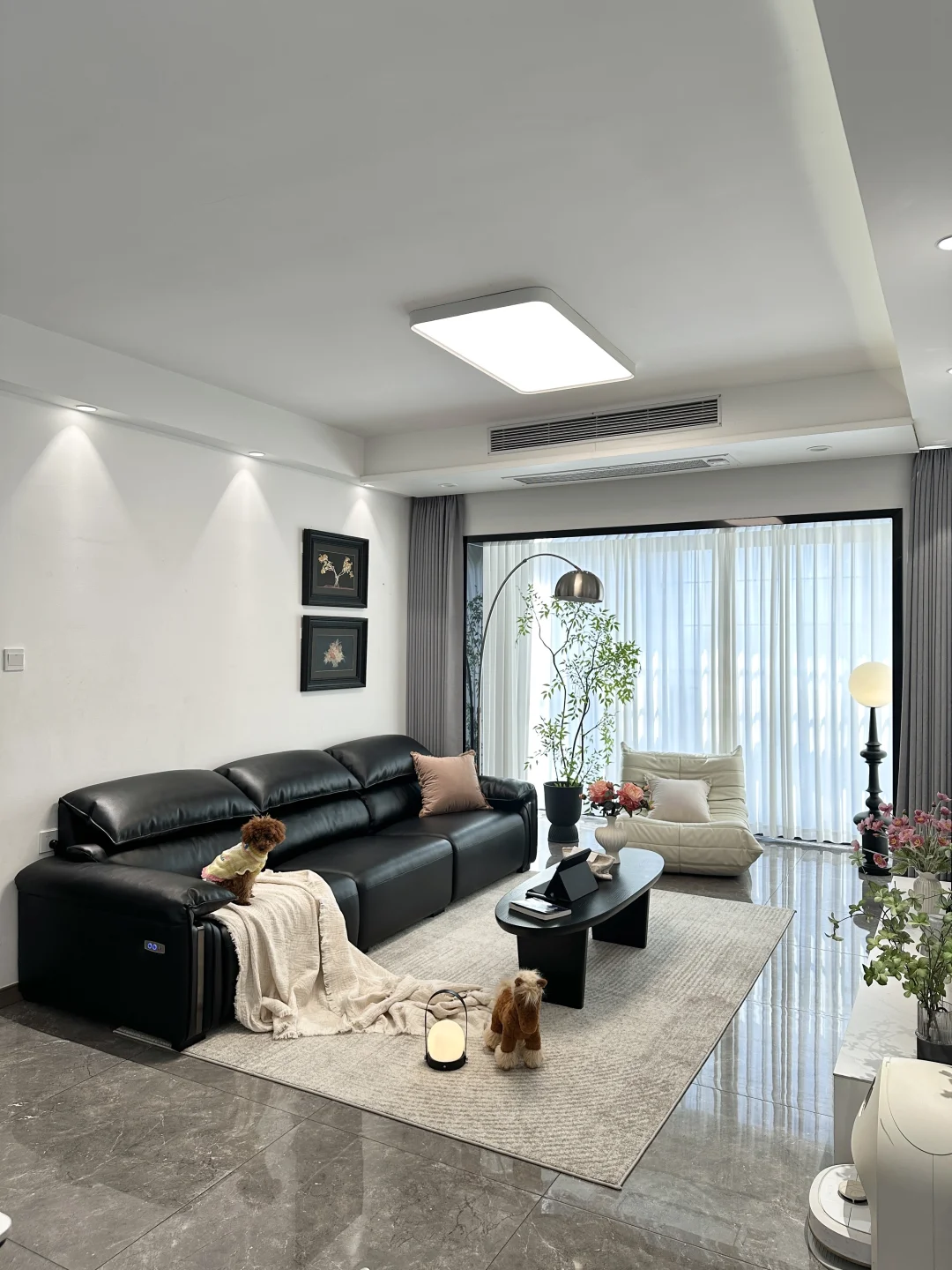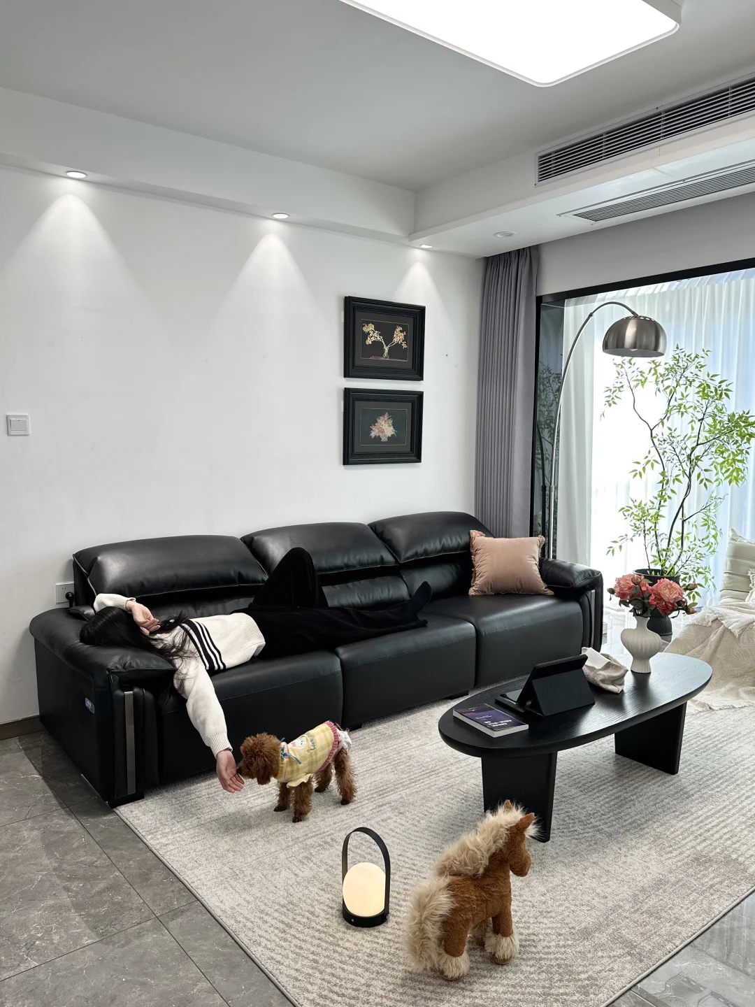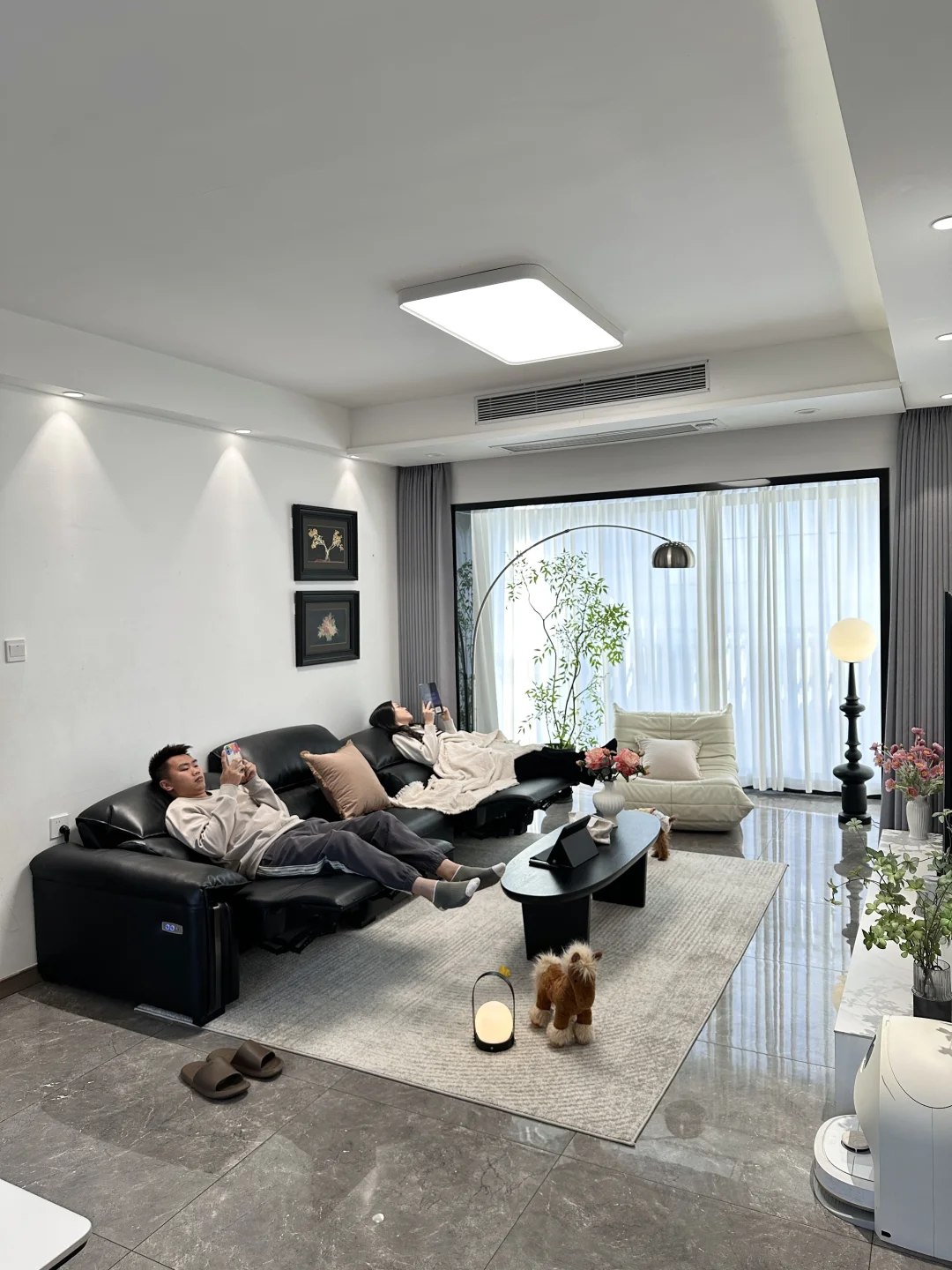 120平建面,90平套内的精装房🏠 四房两厅两卫,双阳台户型 交房后没有做大的改动~硬装基本保留 客厅封了阳台后空间显大了不少 家里的软装搭配围绕黑白粽配色,简约又大气 客餐厅一体,开窗后客厅特别通风 餐厅做了一整面墙的餐边柜为主要收纳区 日常的杂物都能藏起来,客餐厅干干净净的 客厅的开间3.6m,沙发背景墙长3.2m 沙发我选的是佐尔适大象耳朵功能沙发,长2.95m 尺寸放上去刚刚好,98cm宽度对小户型很友好[偷笑R] 这沙发的材质是加厚头层牛皮,摸起来温润细腻的,质感绝了,打理起来也贼省事,脏了擦一擦就干净。里面是空气棉+乳胶+紫罗兰海绵等五层填充,软硬适中,承托力超棒,坐再久也不觉得累,也不用担心会塌陷。 它还是双电机设计真的太香了,我和老公一人躺一边调节角度完全不互相打扰,德国进口的电机运行起来丝滑得很,110°-160°的角度随便调,按一下就停,不管是看电视、看书还是玩手机,都能调到最舒服的姿势。 而且它是0靠墙的设计,电动位也不额外占空间,客厅看着更整洁大气。沙发两侧还带USB充电口,手机没电随手充,一家三口窝在沙发上追剧,幸福感直接拉满!入住两年依旧觉得选对了~
