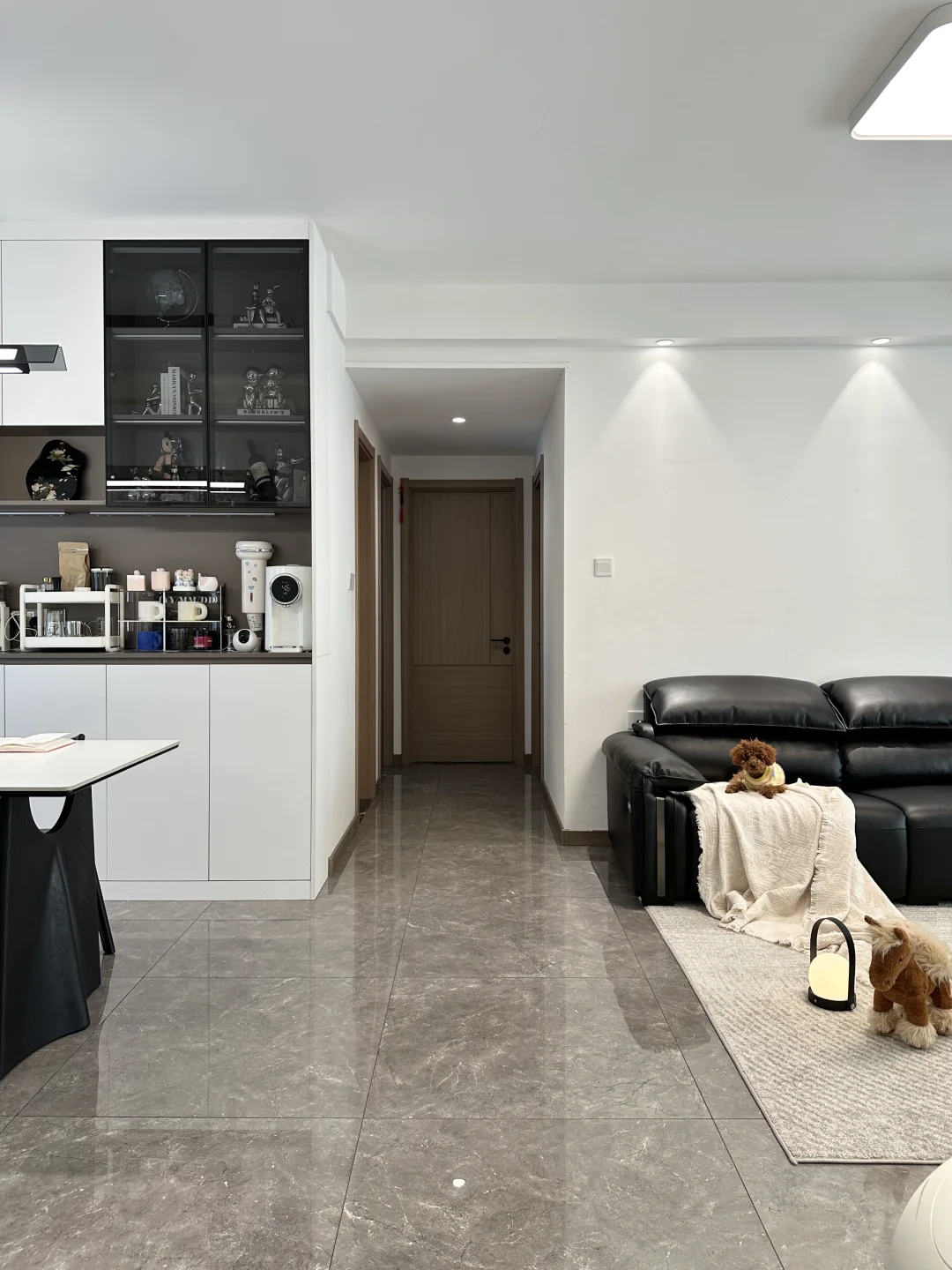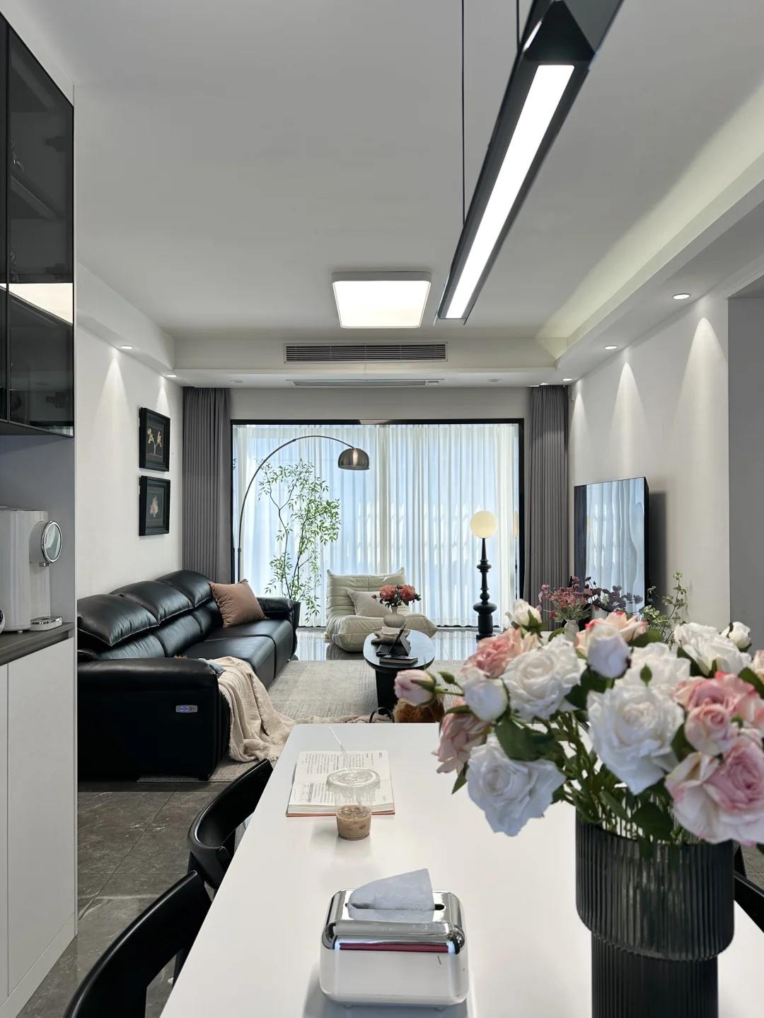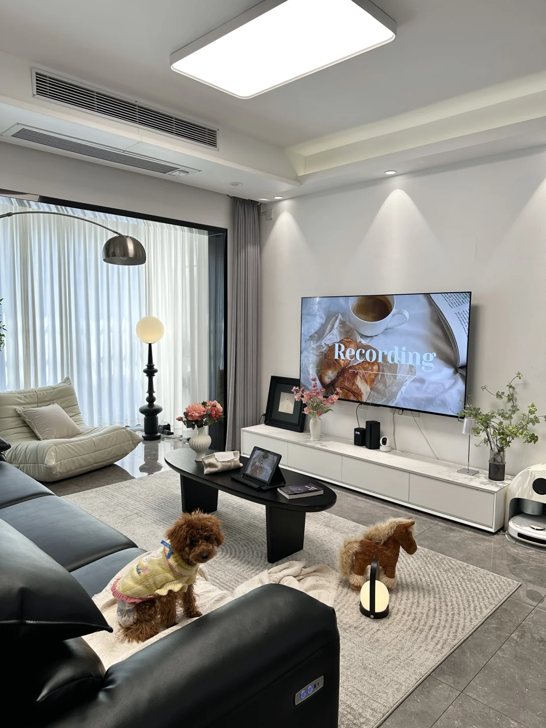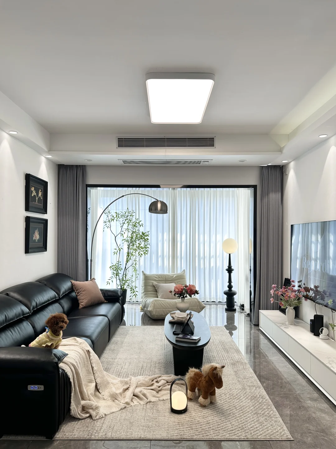 120平建面,90平套内的精装房🏠 四房两厅两卫,双阳台户型 交房后没有做大的改动~硬装基本保留 客厅封了阳台后空间显大了不少 家里的软装搭配围绕黑白粽配色,简约又大气 客餐厅一体,开窗后客厅特别通风 餐厅做了一整面墙的餐边柜为主要收纳区 日常的杂物都能藏起来,客餐厅干干净净的 客厅的开间3.6m,沙发背景墙长3.2m 沙发我选的是佐尔适大象耳朵功能沙发,长2.95m 尺寸放上去刚刚好,98cm宽度对小户型很友好[偷笑R] 这沙发的材质是加厚头层牛皮,摸起来温润细腻的,质感绝了,打理起来也贼省事,脏了擦一擦就干净。里面是空气棉+乳胶+紫罗兰海绵等五层填充,软硬适中,承托力超棒,坐再久也不觉得累,也不用担心会塌陷。 它还是双电机设计真的太香了,我和老公一人躺一边调节角度完全不互相打扰,德国进口的电机运行起来丝滑得很,110°-160°的角度随便调,按一下就停,不管是看电视、看书还是玩手机,都能调到最舒服的姿势。 而且它是0靠墙的设计,电动位也不额外占空间,客厅看着更整洁大气。沙发两侧还带USB充电口,手机没电随手充,一家三口窝在沙发上追剧,幸福感直接拉满!入住两年依旧觉得选对了~