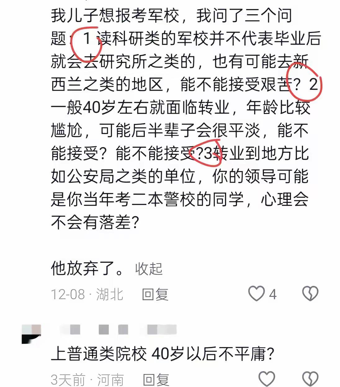 看看这些985、211的,哪一个不是从千军万马里杀出来的?为了一个岗位,笔试面试层层闯关,就算侥幸被录用,又能怎样?就能一帆风顺、青云直上了?还不是照样得在体制内察言观色,唯唯诺诺,加班加到昏天黑地。这位家长真不知从那里来的底气,来看低报考军校的考生,真是无知者无畏。 其实说白了,不出意外,99.9%的孩子注定是普通人。若以正处为线,军校生尚有5%的可能,非军校生只剩0.5%。难道读了名牌大学,就能凭空飞黄腾达?大部分人终究一辈子普普通通,真正能撑得起人生高度的,从来不是一纸文凭,而是骨子里的韧劲与选择的底气。 反观军校生,看似被“安排”,却早早攥住了安稳的底牌,工作有托底,生活有保障,不用在生存焦虑里疲于奔命。这么一比,那些拼尽全力挤赛道的双一流精英,反倒像是在迷雾里瞎闯,拼到最后才发现,所谓的光鲜,不过是用无尽内耗换来了一场看似体面的奔波。 985 211 985录取线 985工程院校 985升学 985高校就业 985院校解析