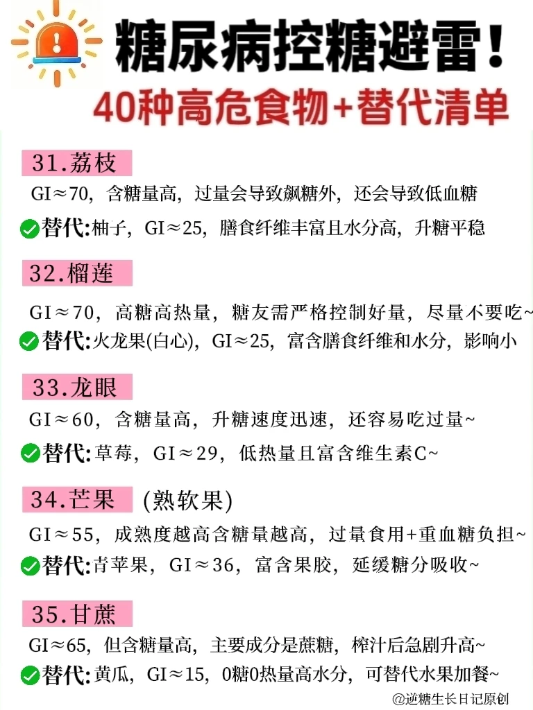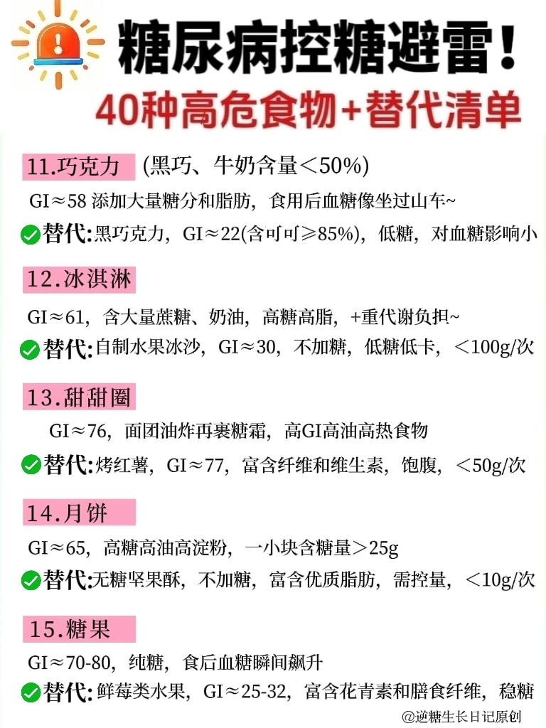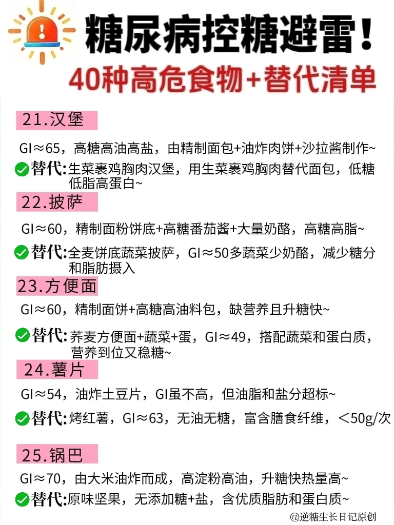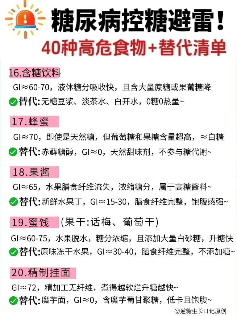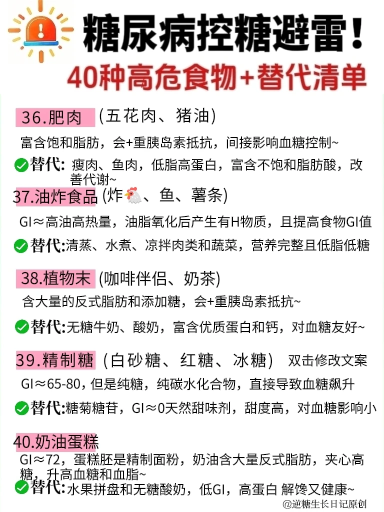 宝子们!谁懂啊!得糖尿病后,生活质量是急速下降,真的太惨了😭 . 每天都小心翼翼的,血糖却像🚀一样蹭蹭飙😭 经过多次实践,才发现,都是因为这些升糖大户在搞怪! ❤️我整理了40种常见控糖高/危食物,都是日常生活中超容易踩坑的,家人们,碰到了一定要警惕!⚠️ ✅也列举了平替它们的低GI替代清单,照着做,轮换着吃,血糖稳如泰.山😎 🔍不管主食、肉类、水果、零食还是酱料,给你们通通都揪出来了~🖕🖕 ☺️以后的控糖一日三餐中,再也不用对着食物纠结“能不能吃”“吃多少” 👭糖尿病患者、控糖减脂的姐妹,赶紧码住!错过真的会后悔哦! 另外,控糖期间,需重点警惕那些添加糖高的精加工食品、高GI的主食、高盐高油高脂高糖的混合零食,都给家人们整理好了,直接拿.走👇 ❌❌❌1. 添加糖重灾区:含糖饮料、碳酸饮料、运动饮料,如奶茶、雪碧、芬达、果汁、糖果、糕点、蜜饯干果、巧克力、饼干等,食用后会让血糖急剧飙升,还可能+重胰岛素抵抗。 . ❌❌❌2. 高GI精制主食:白粥、白米饭、肠粉、白馒头、白面条、米粉、糯米制品,精制碳水化合物易消化吸收,升糖快,血糖波动大。 . ❌❌❌3. 高油高糖陷阱类:各种油炸食品,如炸🐔、薯片、油条、油糕、麻团、桃酥、凤梨酥、沙拉酱、芝麻酱,高油会⬇️胰岛素敏感性,高糖双重叠加,控糖难度翻倍。 . ❌❌❌4. 隐藏糖大户:红烧菜、勾芡、市售番茄酱、加糖豆瓣酱等调味品,大部分加工酱料会添加大量白砂糖,选择时仔细查看配料成分表。 . ❤️家人们,如果你还不知道如何管理好血糖的话,也可以翻翻我以前分享的笔/记,以下问题都可以找到: ✓控糖一日三餐怎么吃、吃什么 ✓如何正确控糖 ✓如何正确戒糖 ✓无意识控糖、 ✓如何恢复正常胰岛功能 ✓日常控糖怎么控 ✓测血糖的正确时间 ✓控糖粗粮 ✓生活化控糖 ✓控糖早餐 ✓控糖一日三餐食谱 ………… 控糖的👭姐妹们,你们踩过哪些坑,分享出来避避雷👏