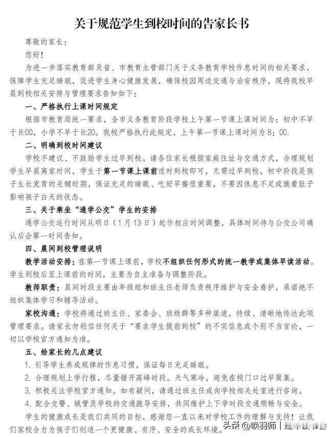 媒体:“推迟到校”要谨防校外增负,遭部分家长反对,怎么看?2026年初,南京多所中学推行“推迟到校”,要求学生7:50后到校,8:00上课,旨在保障学生睡眠。此举引发广泛讨论:支持者认为孩子能多睡会儿;但双职工家长面临送学与上班的时间冲突。 政策背后是教育部对学生睡眠的硬性要求(初中生9小时,高中生8小时)与复杂社会现实的碰撞。部分家长担忧取消早读影响学习,可能陷入“校内减负,校外增负”的循环。 重庆有小学尝试让低年级学生9点到校,但根本出路在于构建社会支持系统。这需要学校提供早到托管,社区协助看护,甚至交通部门开设学生公交专线,实现多方协同,让政策善意真正落地,惠及每个家庭。学校应该取消早晚自习吗 延后上学 南京中小学调课 校园延迟放学 南京小学调休 南京学生压力 小学延迟放学 放宽上学时间 变相强制开学 你觉得晚自习应该取消吗? 江苏高中取消 高一延迟到校 江苏课间延迟 早到校 南京学生调休 不过马路到校 江苏延迟开学吧