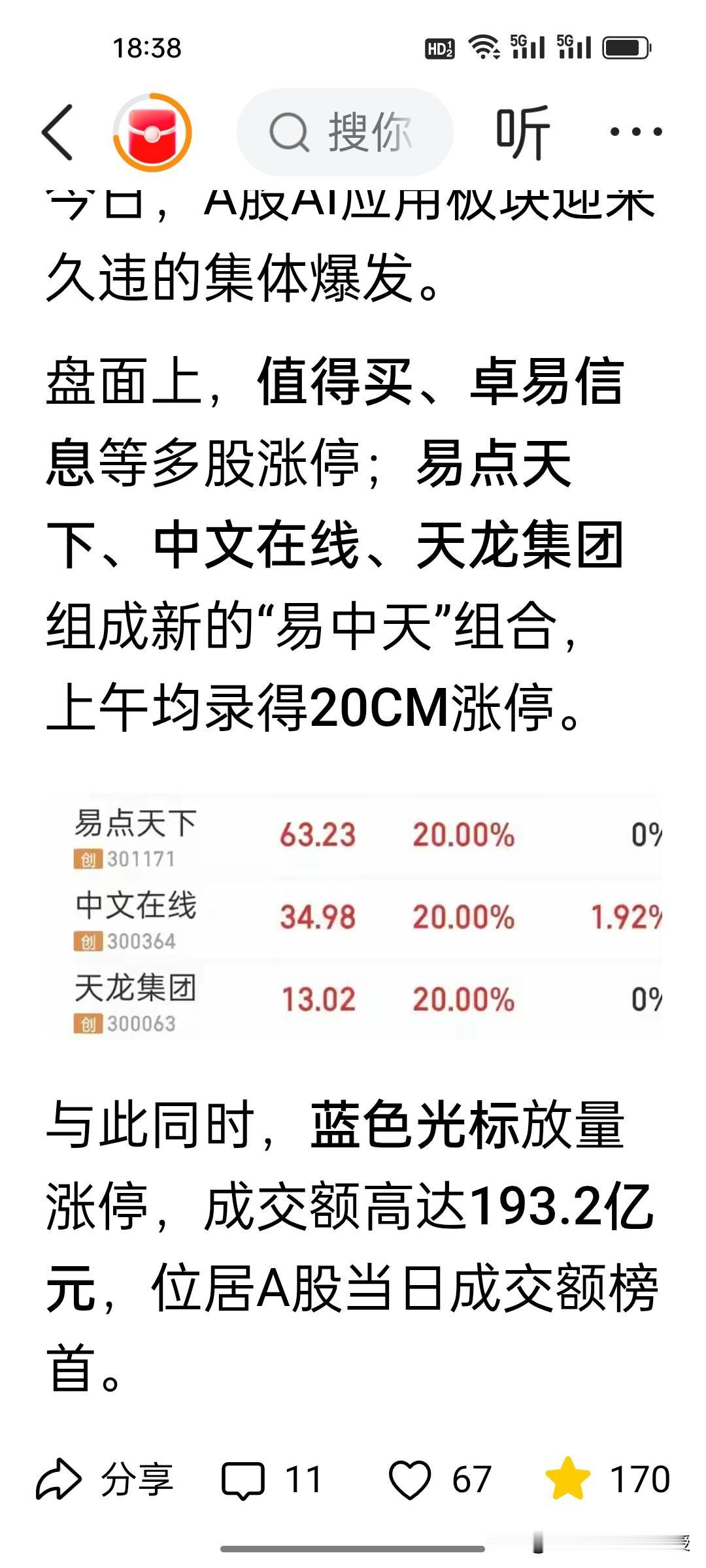易中天做梦也想不到,他能从去年的CPO光模块火到今年的AI应用,“旧易中天”涨幅都在三五倍,“新易中天”也是涨幅惊人,易点天下,中文在线,天龙集团今天更是早早地20厘米涨停。牛市的氛围越来越浓,大盘全天成交3.6万亿,市场情绪被17连阳彻底点燃。今天金融板块还在压着指数,不然这几天都会是百点长阳。 我们国家的大战略是要行稳致远的“慢牛”,而不是短暂的“疯牛”,如果没追上这些20厘米个股的投资者也不用轻易割肉去高位追这些热点板块,因为板块轮动会非常快,预计今年行情会“雨露匀沾”,让散户赚到钱的效应会更明显。