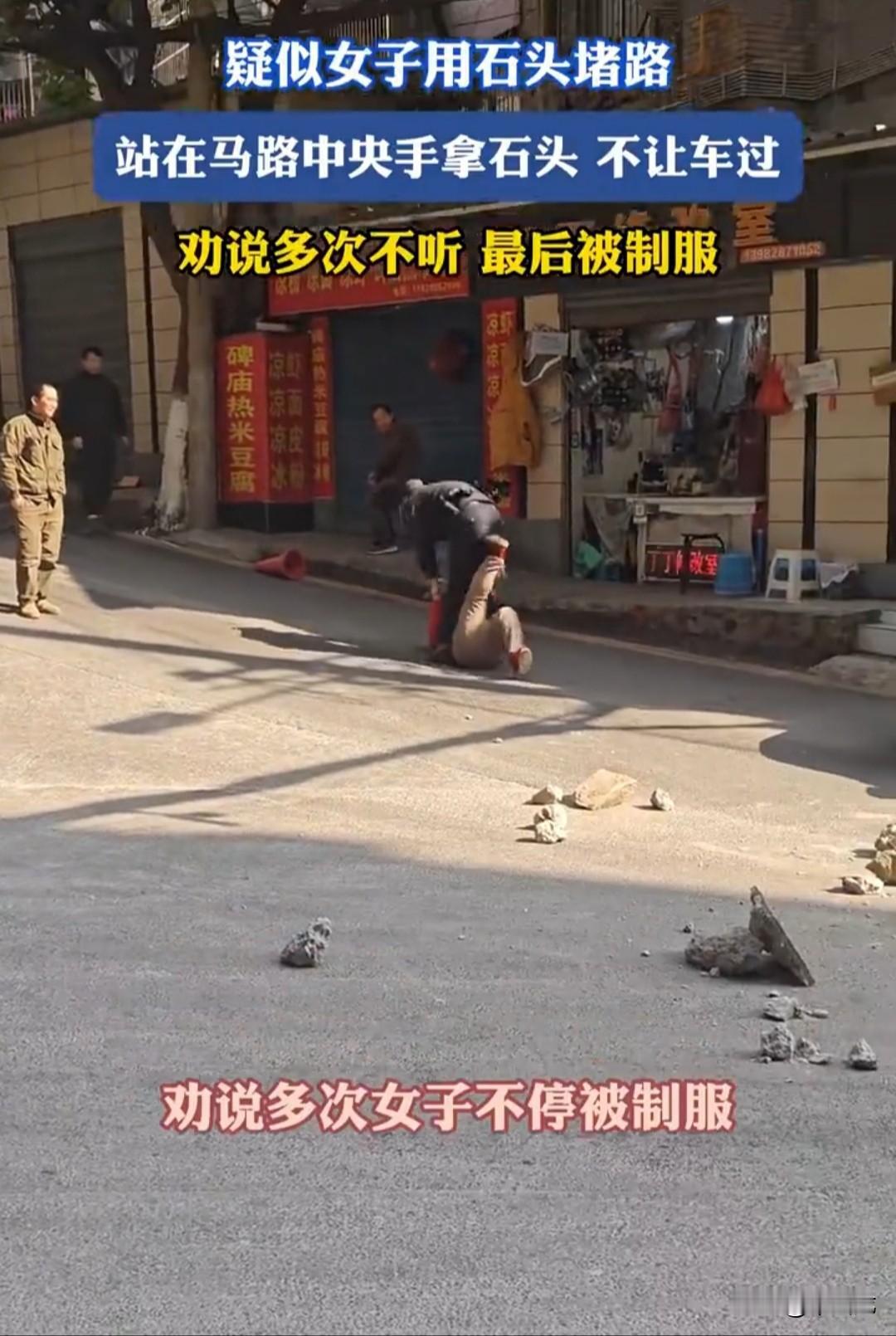 女子把石头摆放在马路中央堵着路,不让车辆通行,手里还拿着两个比鹅蛋还大的鹅卵石,示威般地抛着玩。 看着她虎视眈眈的样子,过往车辆和行人都吓得按下了静止键,不敢再过来。 其实地上摆放的都是些小石头,车辆和行人真的要过,也不会有太大困难。 但女子手里拿的石头威胁就大了,贸然驶了过来,谁也不能保证她突然暴露,拿起石头就砸。 万一女子是个精神病患者,那就亏大了。 她倒不用承担法律责任,自己受的伤害找谁去要赔偿。 帽子叔叔也来了,劝说女子将手里的石头放下,将地上的石头挪开。 但女子置若罔闻,还用威胁的口吻说,谁敢动一动地上的石头,她就砸。 眼看劝说无效,帽子叔叔只能果断出手,将女子强行制服。 如果女子不是精神病患者,她这种行为已经构成了寻衅滋事罪。 如果她是精神方面有问题,恐怕只有不了了之了。