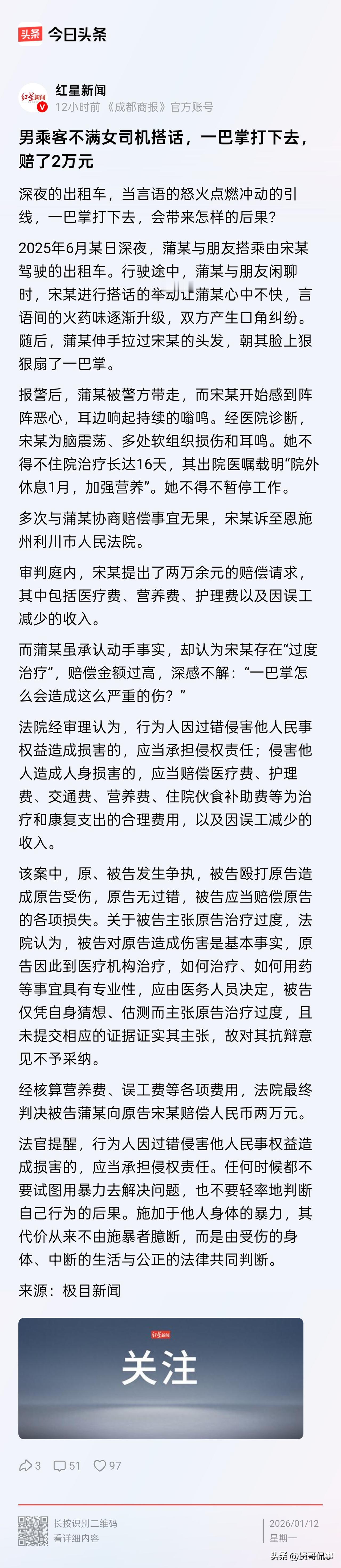 “冲动是魔鬼!”湖北恩施,一男子和朋友乘出租车聊天时,女司机中途搭话,双方随即发生口角。而后,男子气不过,就上前直接给了女司机一巴掌,将女司机打成了脑震荡。事后,女司机将男子告上法院要求赔钱。法院判赔20000元,如何评价此案? 宋女士是一位出租车司机,为了养家糊口,她经常会工作到很晚。 事发当天深夜,宋女士正准备收工时,又接到一个订单。 到达指定位置后,上车的是两名男子,其中一人系蒲某,而另一人则是蒲某的朋友。 行驶途中,蒲某和朋友聊的热火朝天。 宋女士见状,便凑上去随口搭了句话,可这却让蒲某感到格外不爽。 随后,两人便在车上发生了口角。 吵到情绪激动时,蒲某更是伸手拉住宋女士的头发,并狠狠扇了她一巴掌。 宋女士事后报警,蒲某被警方带走,宋女士很快出现恶心、耳鸣等症状,经诊断为脑震荡、多处软组织损伤。 后来,宋女士在医院住院治疗了16天,医嘱要求宋女士出院后需休息1个月并加强营养,宋女士不得不暂停工作。 因和蒲某多次就赔偿问题协商无果后,宋女士直接将蒲某告上法院,索赔医疗费、误工费等费用共计20000余元。 对此,有网友评论:“作为司机,应该开好自己的车,管好自己的嘴!既然乘客没跟司机说话,司机就不应该插嘴,不礼貌。但是乘客因此打人就是人品问题了,也该罚。” 也有网友认为,宋女士这是在狮子大开口,一个脑震荡住十多天的院,是不是过度医疗了? 1、无论宋女士插嘴的问题有多么严重,这只涉及在道德范畴。蒲某没有压制住自己的脾气,动手对宋女士实施殴打,这就要涉及违法了。 根据《民法典》规定,因过错造成他人受伤,应承担侵权责任。 本案中,宋女士在没有过错的情况下,蒲某主动施暴致其受伤,需全额赔偿损失。 2. 两万赔偿并不是“狮子大开口”,而是每一笔都有依据。 宋女士主张的医疗费,凭医院收费凭证、病历即可认定;误工费按住院16天加休息1个月的误工时长计算;医生医嘱要求等,都可证明其他的费用。 要是蒲某觉得“过度治疗”,得自己拿证据证明,蒲某没提供证据,法院自然支持宋女士的合理诉求。 最终,法院经核算,判决由蒲某支付宋女士20000元的赔偿。 3. 除了赔钱,蒲某还可能面临行政或刑事责任。 一般的殴打他人行为,构成治安管理违法的,警方会给予拘留、罚款等治安处罚; 如果造成轻伤及以上的后果,就可能构成故意伤害罪,面临牢狱之灾。 本案中蒲某殴打宋女士的行为,至少涉嫌治安违法,依法其要承担行政责任。 不得不说,蒲某的这一巴掌,不仅扇疼了别人,也让他自己付出了沉重的代价。 要知道,对于普通人而言,2万元得花多少时间去赚啊。 总之,大家在生活中,难免会与他人产生摩擦,但切记!再生气也千万别动手!因为一时冲动的代价,终究还得自己全额买单。 对此,你怎么看?欢迎大家在评论区留言。