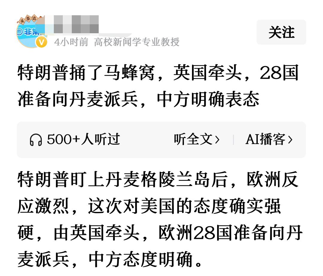 特朗普想要获得格陵兰岛?!没那么简单! 现在的自媒体,比如图一标注为新闻学教授的这位,居然说出欧洲要派兵保卫格陵兰岛的笑话! 实际上,欧洲人根本不担心美国对格陵兰的武装夺取,因为,丹麦早就和美国签署过允许美国无限制在格陵兰岛进行驻军的协议。如果美国真要武装夺取,欧洲人是巴不得!一旦美国武装夺取了格陵兰岛,美军就必须长期派驻大量军队驻扎在格陵兰岛,而这恰恰是欧洲人求之不得的事情! 美国媒体采访特朗普的时候,问特朗普为什么不增加驻扎格陵兰岛的美国驻军,特朗普直接说,“没门,我只要所有权,不要派出美军进行驻扎!” 所以,看到没,特朗普这算盘打得啪啪响,只要好处,一点责任都不付出。欧洲想要美军驻扎格陵兰岛?!美国人没那么蠢! 特朗普的算盘精到何种程度?有人给他算过一笔账,格陵兰岛价值起码一万亿美元,如果美国打算从丹麦购买格陵兰岛,就应该支付给丹麦一万亿美元。特朗普回道,“我们给格陵兰每个人一万美元,只要他们支持独立并并入美国!”格陵兰岛总共有5万居民,特朗普一句话就能给美国省0.995万亿美元。[捂脸] 所以,特朗普不会真的用武装入侵的方式占有格陵兰岛的,如果真要走这一步,美国早就动手了,何必等到现在?! 现在,特朗普的如意算盘是,用武装入侵恐吓丹麦,让丹麦乖乖送上格陵兰岛。但他的如意算盘太精明了,丹麦人不会上当的。至少,怎么也得拉上美军一个师级单位永久驻扎格陵兰岛,欧洲才算不吃亏!因为,格陵兰虽然名义上属于丹麦,但格陵兰岛的任何资源好处,丹麦是一毛钱也拿不到的,格陵兰岛和丹麦的经济关系,其实跟加拿大和英国的关系没啥区别!