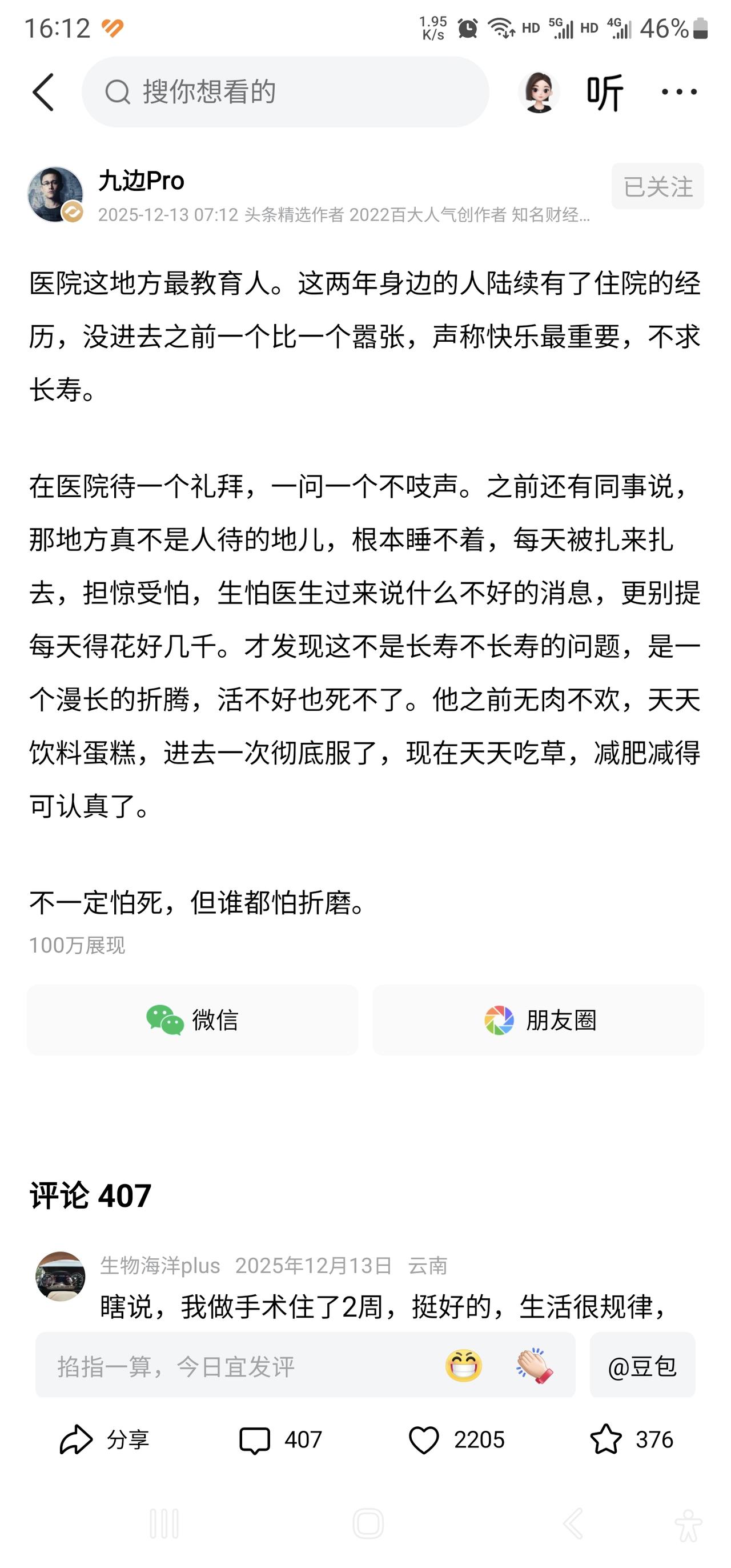 看到@九边Pro 发的一个微头条,颇有感慨。去年一个常在一块喝酒的朋友忽然说要去医院住几天,我问他怎么了,他说应该是糖尿病,生活不规律,暴饮暴食造成的。 网上一直报道说糖尿病和高血压开始年轻化了,这两样病一旦患上还都离不开终身服药。一直没当回事,但当你身边的朋友开始患病,那真的是悚然而惊,去年开始迅速开始调整作息和饮食,努力减肥,运动锻炼身体,别说还真是有效果,体重减了十来斤,确实感觉轻松了不少。 九边说的一句话很好,没住院的时候含着快乐比什么都重要,到了医院一问一个不吱声。如果让我看,其实真的是健康最重要,建立在健康基础上的快乐才是真正的快乐。我们经常说浮财难舍,真到了医院不还是心甘情愿的舍吗?到底什么最重要不是一目了然了吗。 忽然想到,除了生死,病痛其实是对每个人最公平的事情了,无论你是王侯将相还是平民百姓,都逃不过疾病的折磨。它可以让富人瞬间理解穷人的窘迫,也可以让最吝啬的人瞬间变成散财童子。