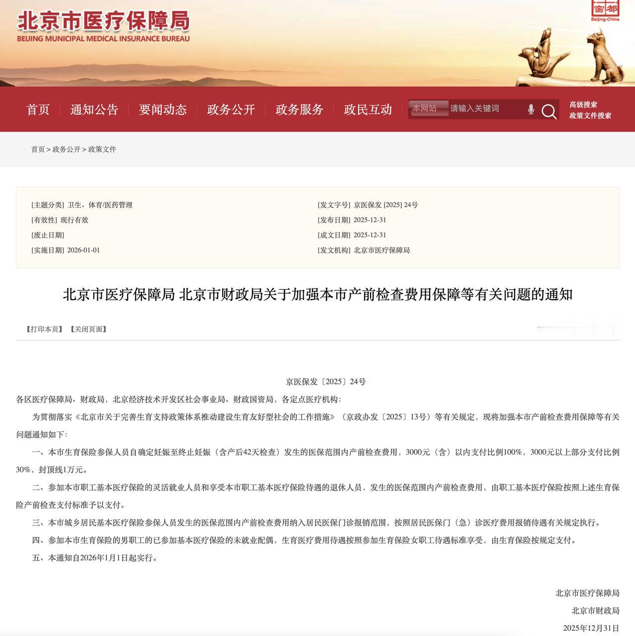 北京市新增退休人员可以报销产前检查的医疗费用 北京市医疗保障局消息: 北京市从2026年1月1日开始新增退休人员可以报销产前检查的医疗费用。是国内为数不多的明确退休人员可以享受与女职工产前检查同等待遇的省份。 按照生育保险的相关规定,生育保险由单位为在职员工缴纳,退休后劳动关系终止,退休人员不在生育保险覆盖的范围内,退休人员若怀孕生育可通过医保报销部分产检和分娩费用。北京将退休人员新纳入产前检查医疗费用报销范围,将提高他们产检费报销的水平。 详见北京市医疗保障局和北京市财政局的文件原文第二条: 北京市医疗保障局 北京市财政局关于加强本市产前检查费用保障等有关问题的通知 京医保发〔2025〕24号 各区医疗保障局、财政局,北京经济技术开发区社会事业局、财政国资局,各定点医疗机构: 为贯彻落实《北京市关于完善生育支持政策体系推动建设生育友好型社会的工作措施》(京政办发〔2025〕13号)等有关规定,现将加强本市产前检查费用保障等有关问题通知如下: 一、本市生育保险参保人员自确定妊娠至终止妊娠(含产后42天检查)发生的医保范围内产前检查费用,3000元(含)以内支付比例100%,3000元以上部分支付比例30%,封顶线1万元。 二、参加本市职工基本医疗保险的灵活就业人员和享受本市职工基本医疗保险待遇的退休人员,发生的医保范围内产前检查费用,由职工基本医疗保险按照上述生育保险产前检查支付标准予以支付。 三、本市城乡居民基本医疗保险参保人员发生的医保范围内产前检查费用纳入居民医保门诊报销范围,按照居民医保门(急)诊医疗费用报销待遇有关规定执行。 四、参加本市生育保险的男职工的已参加基本医疗保险的未就业配偶,生育医疗费用待遇按照参加生育保险女职工待遇标准享受,由生育保险按规定支付。 五、本通知自2026年1月1日起实行。 北京市医疗保障局 北京市财政局 2025年12月31日