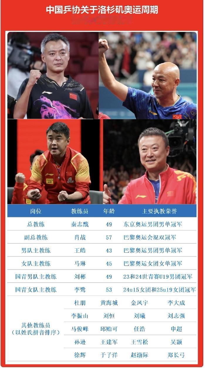 结果出炉,各司其职 2025年底的国乒教练员审核结果出来了, 秦志戬作为总教练, 肖战作为副总教练, 王皓,男队主教练, 马琳,女队主教练, 刘彬,国青男队主教练, 李鹭,国青女单主教练, 还有20名教练员, 后续也将各司其职!