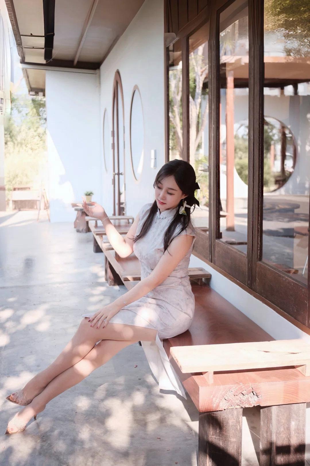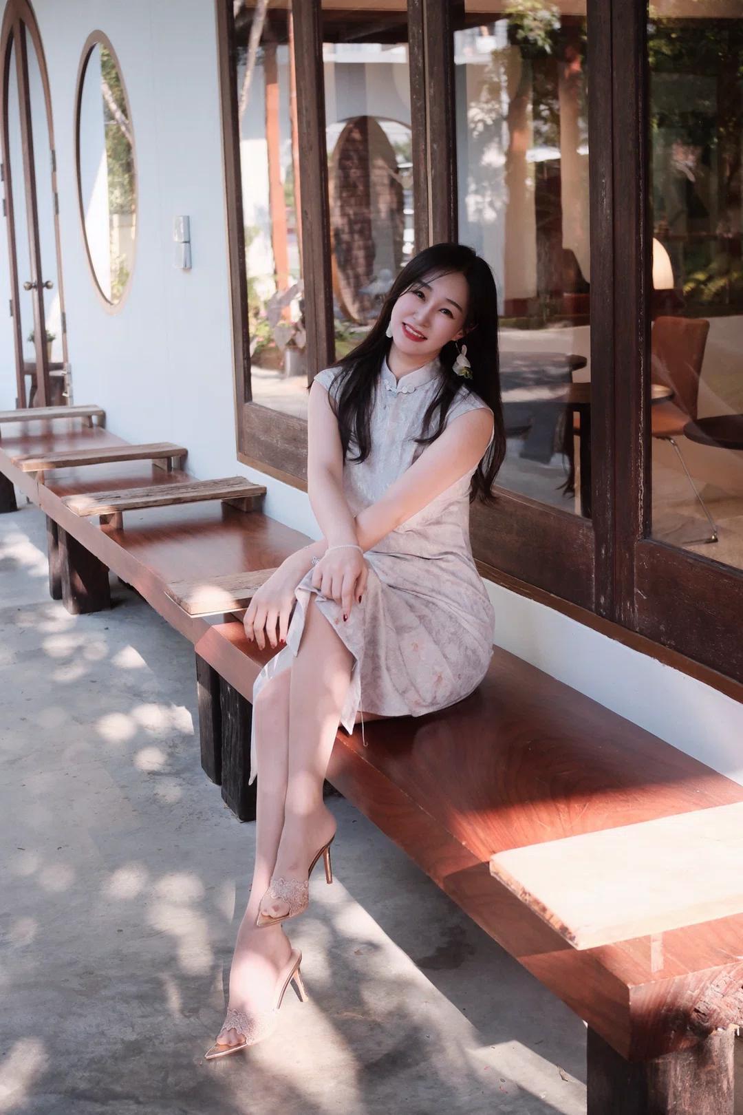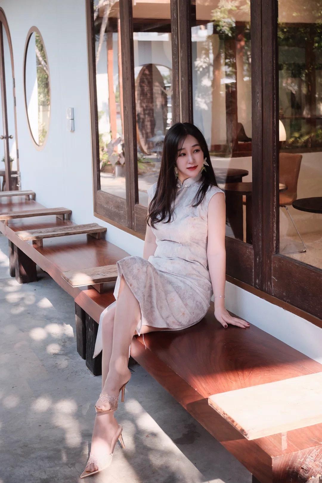 图片中是一位坐在木质长椅上的女性,她身穿浅色带有花纹的无袖旗袍,脚踩一双浅色高跟鞋,佩戴着耳饰,头发披肩,面带微笑看向镜头。 - 人物穿着 :她穿着一件浅色带有花纹的无袖旗袍,款式较为修身,展现出优雅气质;脚上是一双浅色高跟鞋,鞋面上有装饰细节,整体搭配显得精致且富有韵味。 - 人物姿态 :她坐在木质长椅上,身体微微侧向镜头,一只手自然地搭在长椅上,另一只手放在腿上,姿态放松而从容,展现出一种自信与优雅。 - 所处环境 :背景是一栋建筑的外墙,墙面为白色,配有深色木质窗框和圆形窗户,旁边还有几把木质椅子,地面是水泥材质,阳光透过树叶洒下斑驳光影,营造出一种宁静舒适的氛围。