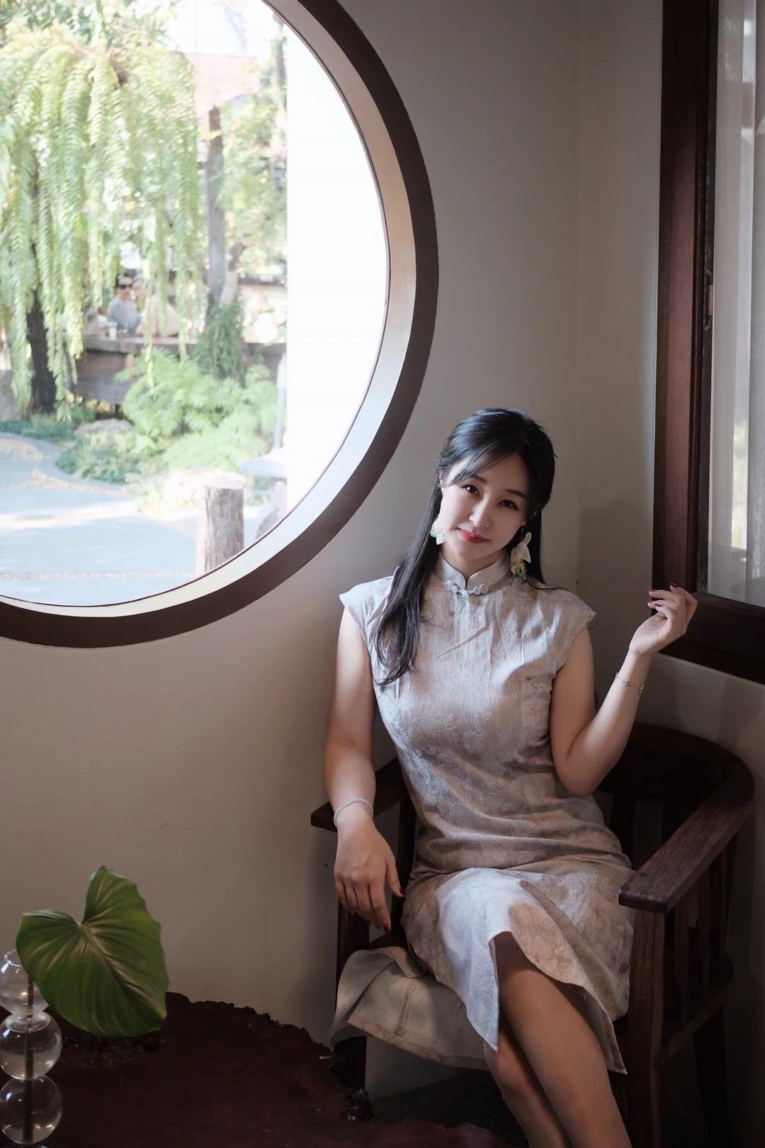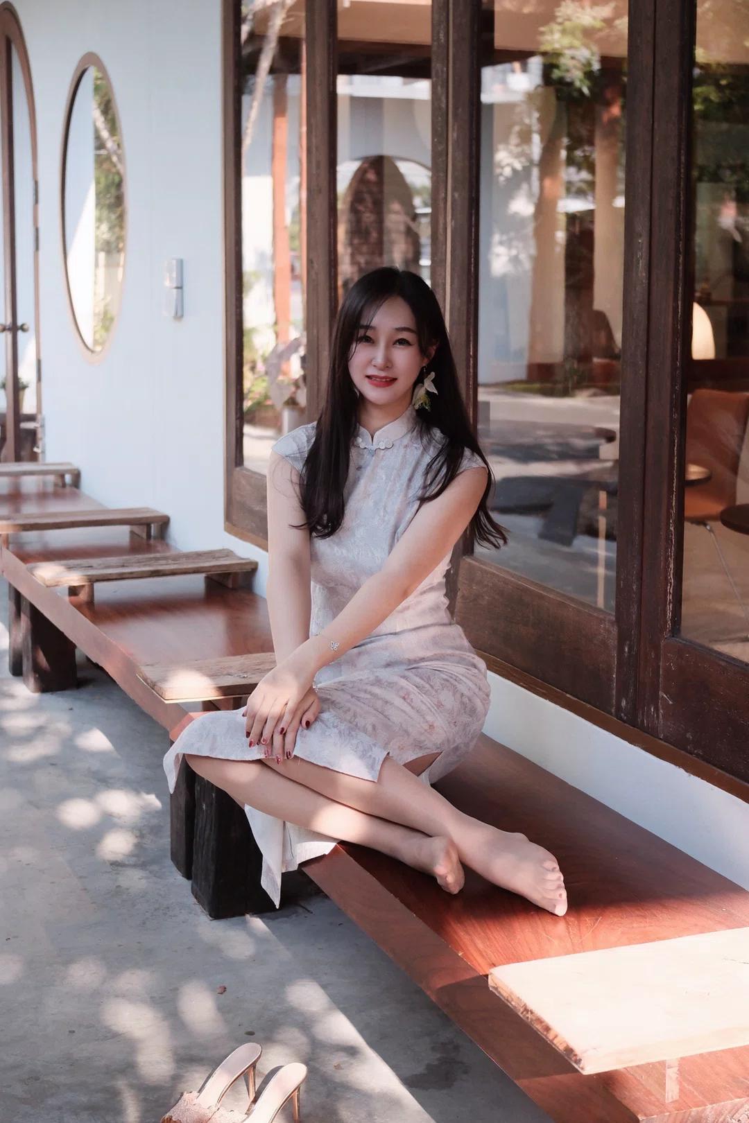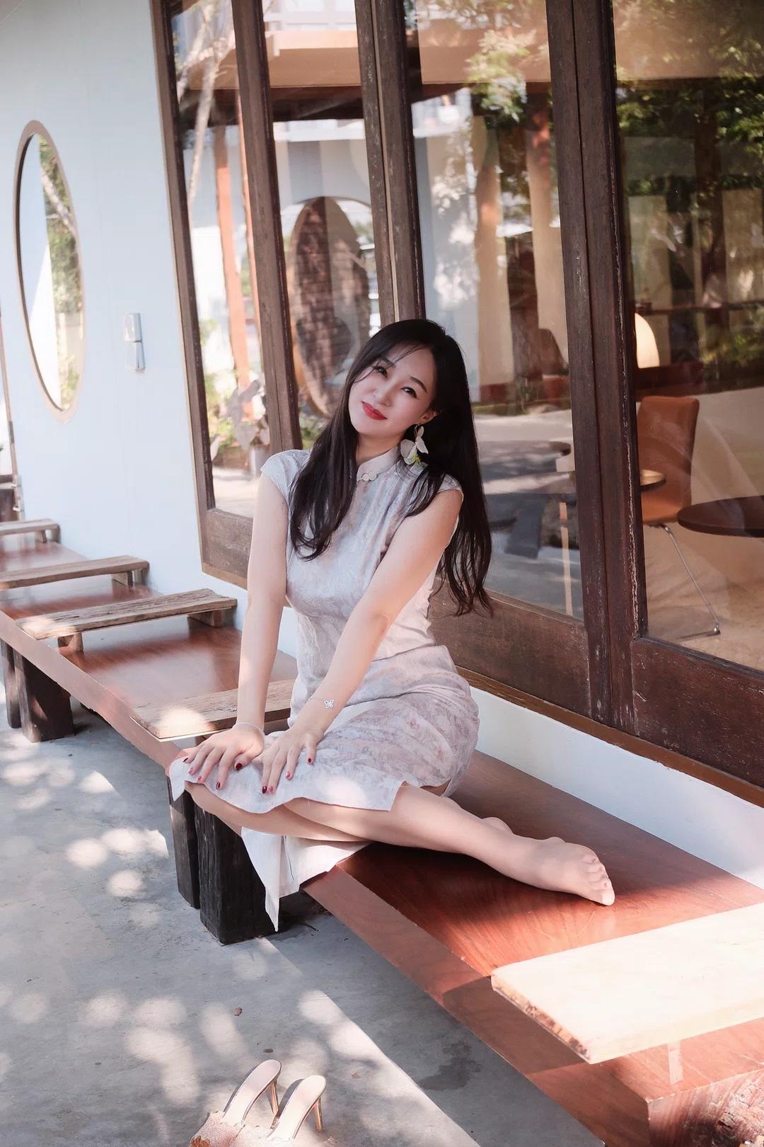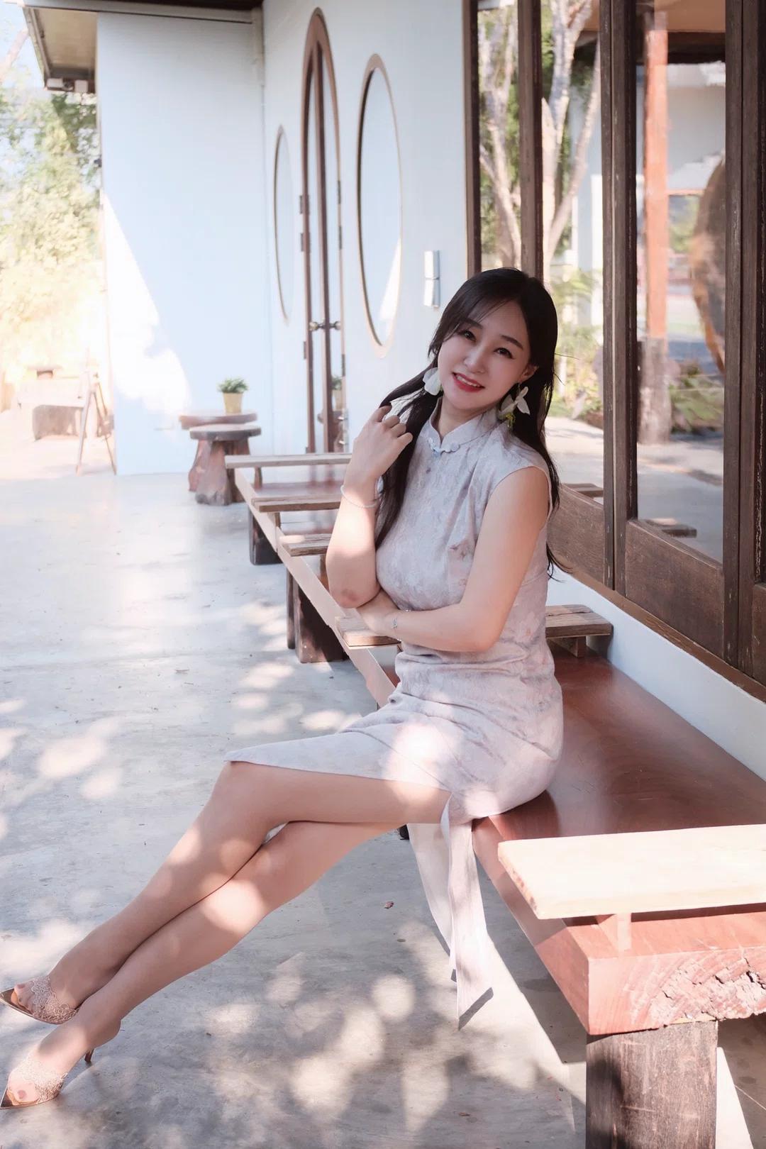 图片中是一位坐在木质长椅上的女性,她身穿浅色带有花纹的无袖旗袍,脚踩一双浅色高跟鞋,佩戴着耳饰,头发披肩,面带微笑看向镜头。 - 人物穿着 :她穿着一件浅色带有花纹的无袖旗袍,款式较为修身,展现出优雅气质;脚上是一双浅色高跟鞋,鞋面上有装饰细节,整体搭配显得精致且富有韵味。 - 人物姿态 :她坐在木质长椅上,身体微微侧向镜头,一只手自然地搭在长椅上,另一只手放在腿上,姿态放松而从容,展现出一种自信与优雅。 - 所处环境 :背景是一栋建筑的外墙,墙面为白色,配有深色木质窗框和圆形窗户,旁边还有几把木质椅子,地面是水泥材质,阳光透过树叶洒下斑驳光影,营造出一种宁静舒适的氛围。