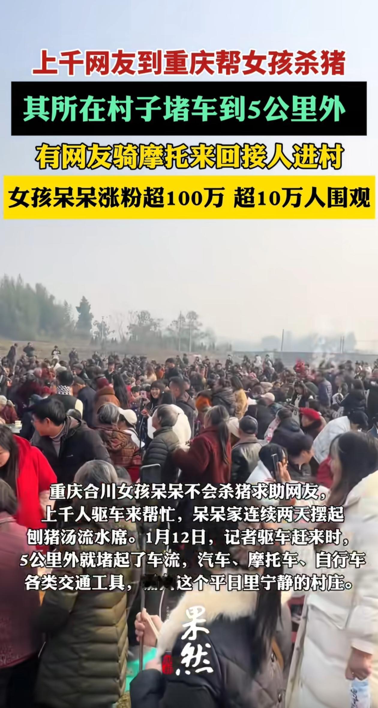 谁也没想到杀猪会有这么大场面,重庆合川女孩“呆呆”没想到,合川文旅也没想到,上千网友自发来“呆呆”家里帮忙“按猪”,吃泡汤饭,村道堵了几公里,门前比菜市场都热闹,相关部门也是默默地做好了协助。这个事情可以看到“呆呆”宣传家乡得到了广泛的自发的支持,不过可以猜想的是,好多按完猪吃了泡汤饭的估计都泡汤了,一些人原本应该是来相亲的吧?