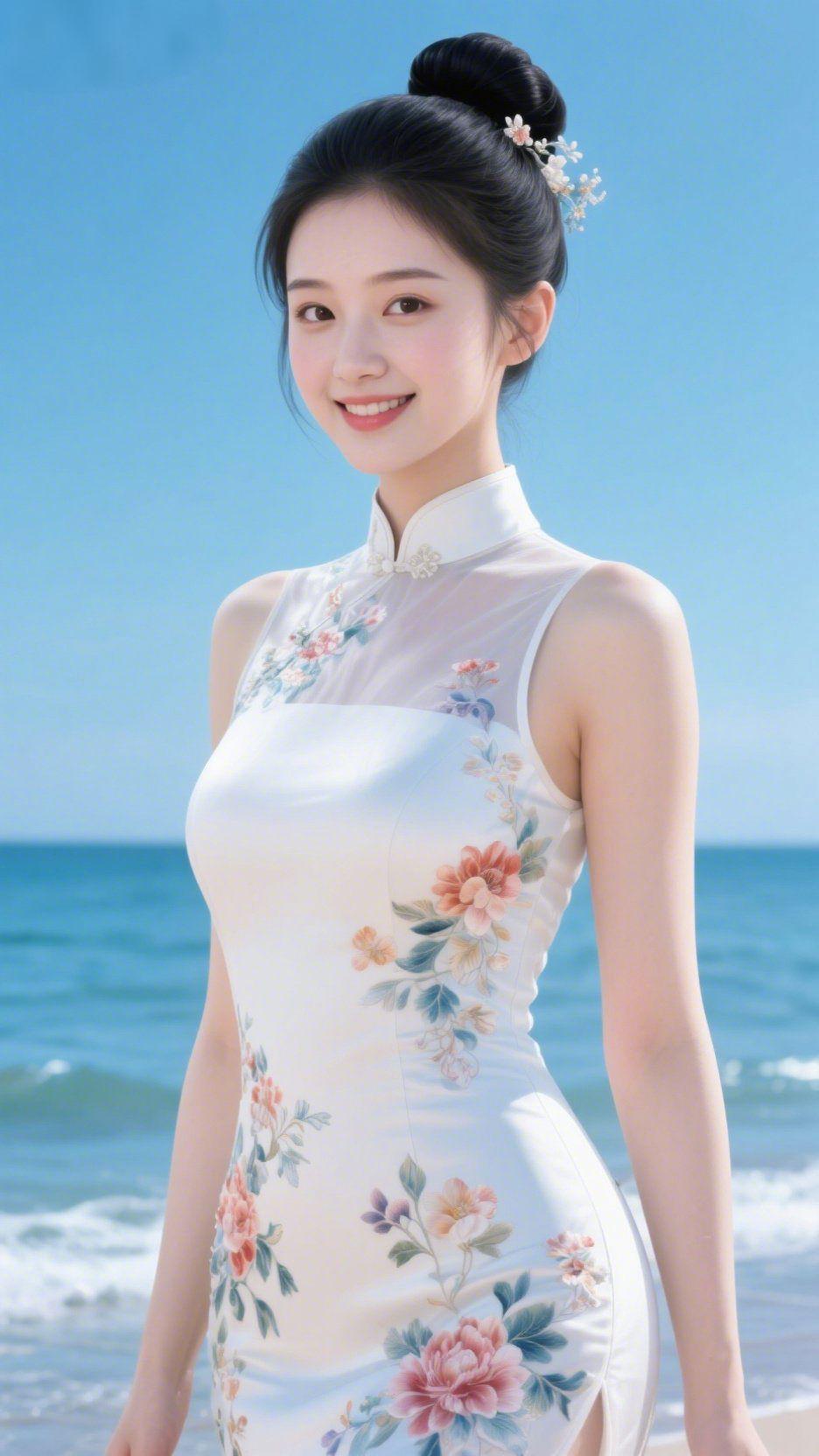 白襟花影立晴滩 晴光浸蓝海面时,她立于滩边风里。素白旗袍缀着柔粉花簇,轻纱肩领衬得眉目明润,发间花饰随海风轻颤——似将春庭花事,织作裙身的温婉。 笑意舒展时,眼底漾着浪尖的光。衣料裹着温软风息,如展开一页浸了咸香的笺:是白的净裹着花的柔,是海的蓝融着笑的暖,是时光栖于岸畔的,半程清宁。 无需多言,这抹白落进海色里,便让周遭都轻缓下来。原来美从非张扬,是恰好的风、恰好的花,和恰好栖于襟边的,半缕晴光。 海畔旗袍雅韵 素白国风穿搭