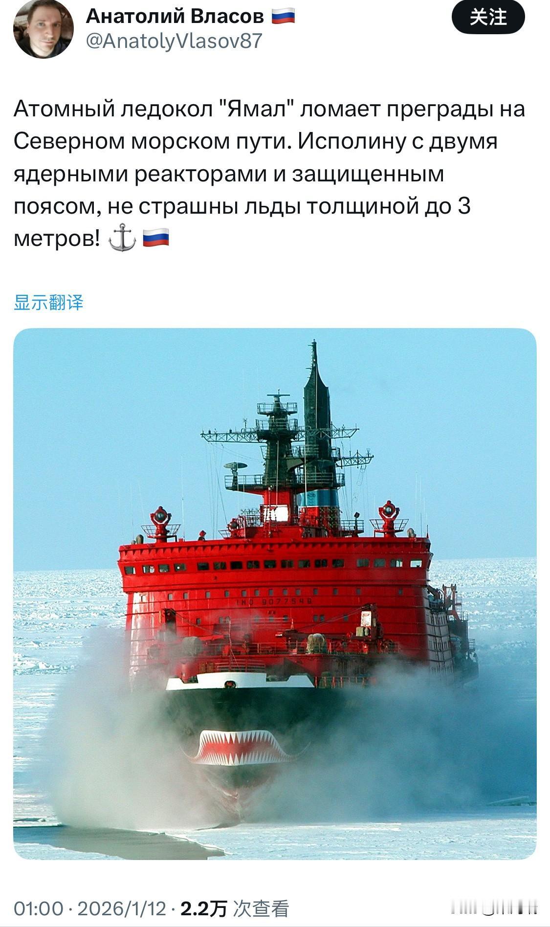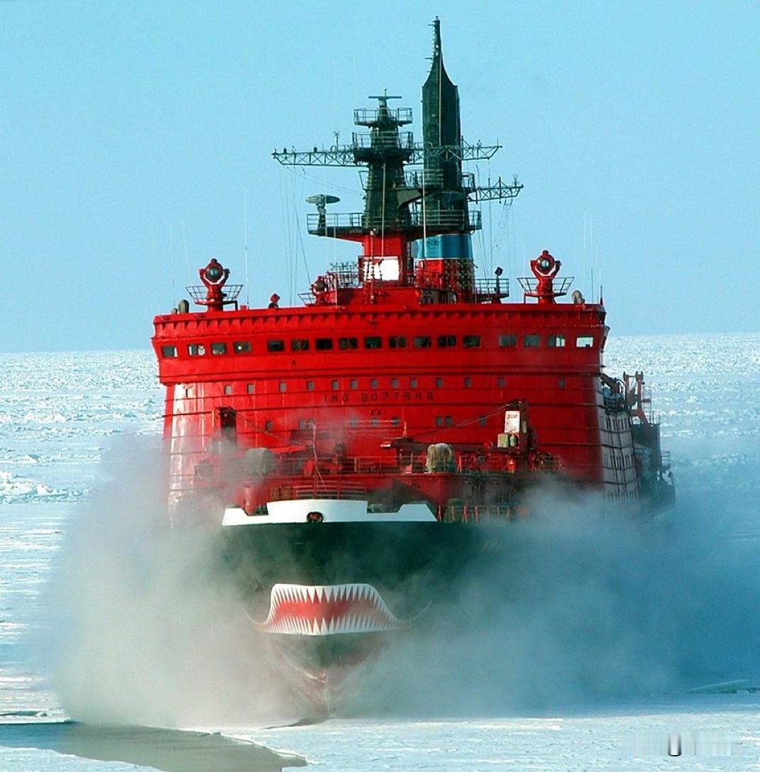 俄罗斯核动力破冰船“亚马尔”号正在北海航线上破冰前进。这艘拥有两座核反应堆和防护带的巨型破冰船,面对厚达3米的冰层也毫不畏惧! 关于“亚马尔”号的一些详细信息: 动力系统: “亚马尔”号由两座核反应堆提供动力。 破冰能力: 该船能够以约3节(5.6公里/小时)的速度连续破除2.3米(7.5英尺)厚的冰层。其最大设计破冰能力可达5米。在实际操作中,它曾破开过厚达9米的冰脊。 特色外观: 该船一个显著的特点是其船头涂绘的鲨鱼嘴图案,最初是船体设计元素,后来应旅游公司的要求而保留。 主要任务: 破冰船的主要任务是在北方海航线(Northern Sea Route)上为货船提供破冰引导服务,同时也用于科学考察和北极探险旅行。 厚达3米的冰层,虽然超出了其常规连续破冰能力(2.3米),但在特定情况下(例如使用压水舱系统或采用“冲撞-后退”策略)仍能应对。俄罗斯目前最强大的新型22220型核动力破冰船,例如“北极”号,设计上可以破除3米厚的冰层。