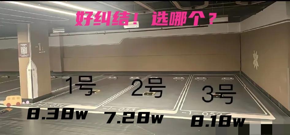好纠结啊!为了买个车位三天三夜没睡个好觉了,作为没经验的新手小白,真不知买哪个好一点。本想着在3号和1号当中选一个,老婆非要买2号,说同样的车位可以省一万多块,吵了几天了,吵翻了!!! 求有经验的大神们帮看看,该买哪个好一点,谢谢!!![祈祷]