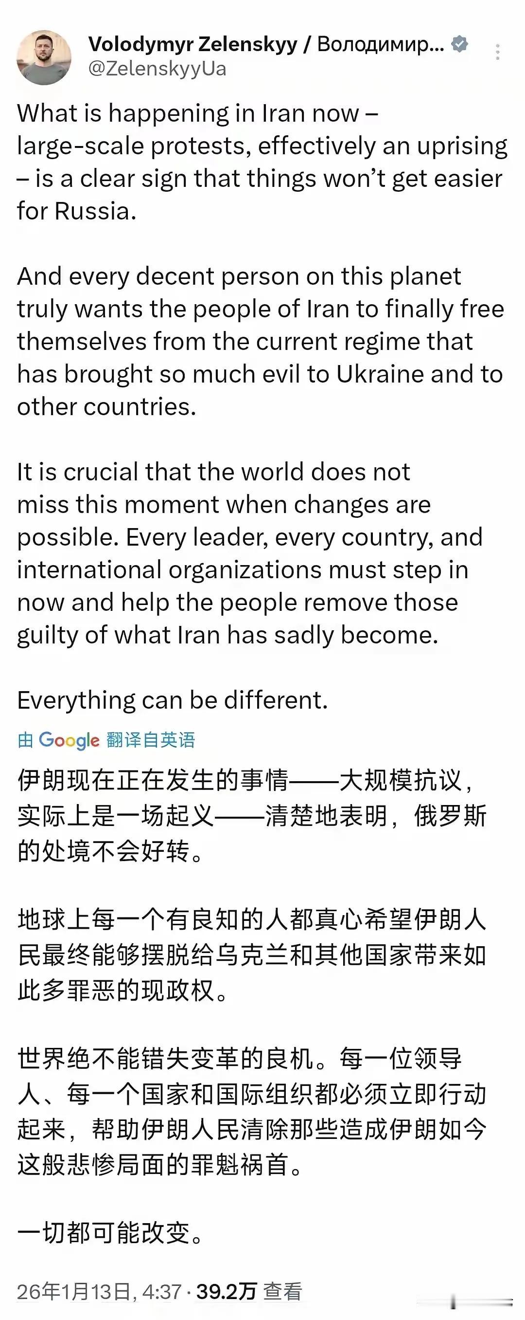 伊朗即将有事?泽连斯基“呼应美国”。针对伊朗近期的动乱,美国国务院开始要求美国公民立即离开伊朗,摆出了一副伊朗即将有事的样子。对于美国的要求,乌克兰总统泽连斯基立即表现出了“支持”。泽连斯基在社媒上表示,基于伊朗正在发生的事情,世界每一个领导人,每一个国家,每一个国际组织都必须行动起来,趁此良机,“解救”伊朗人民。泽连斯基自己的国家都还没有被“解放”,就染指别国,真是吃饱了撑的!