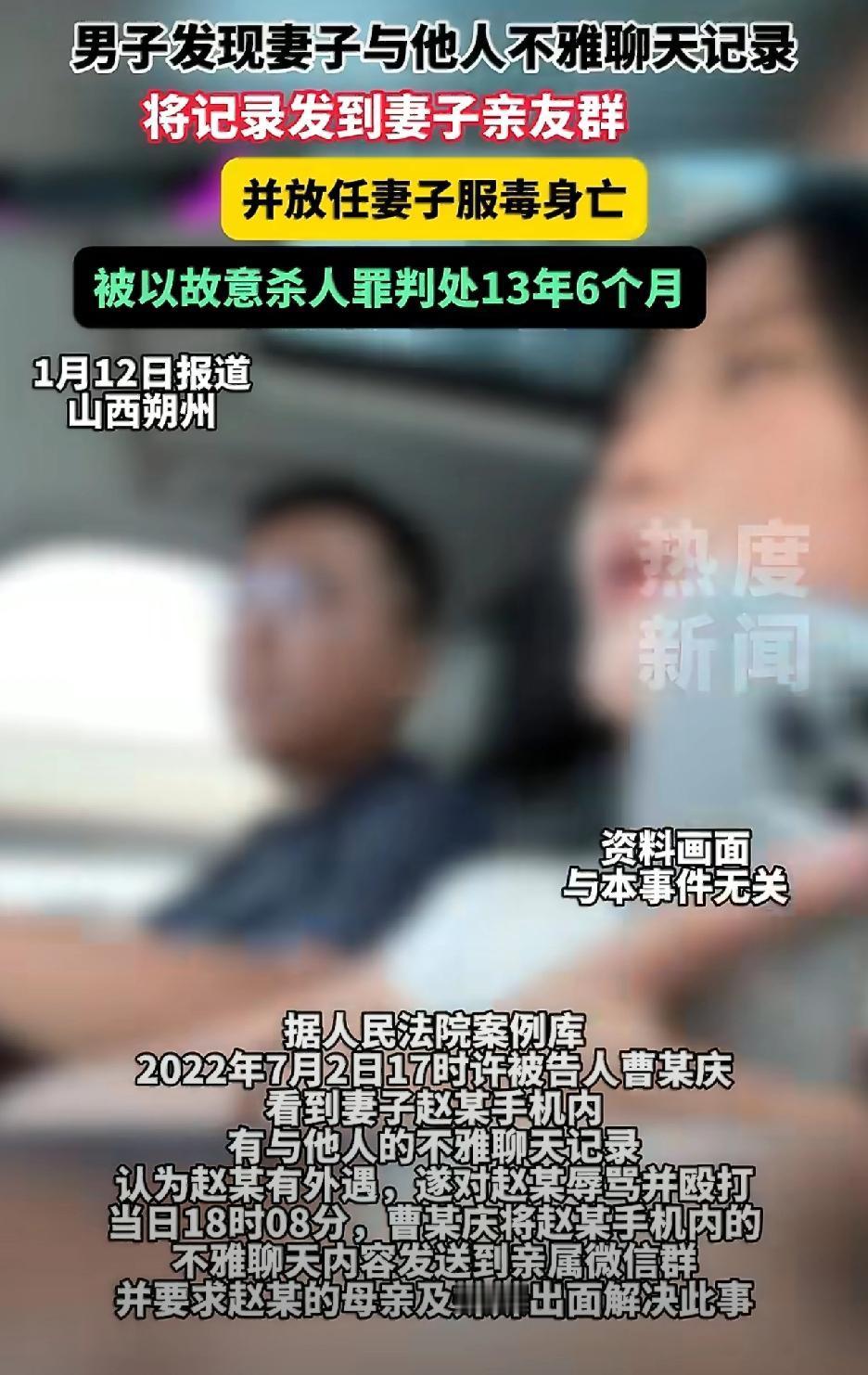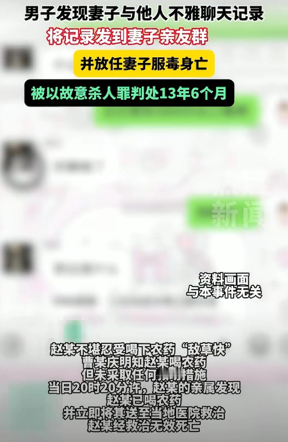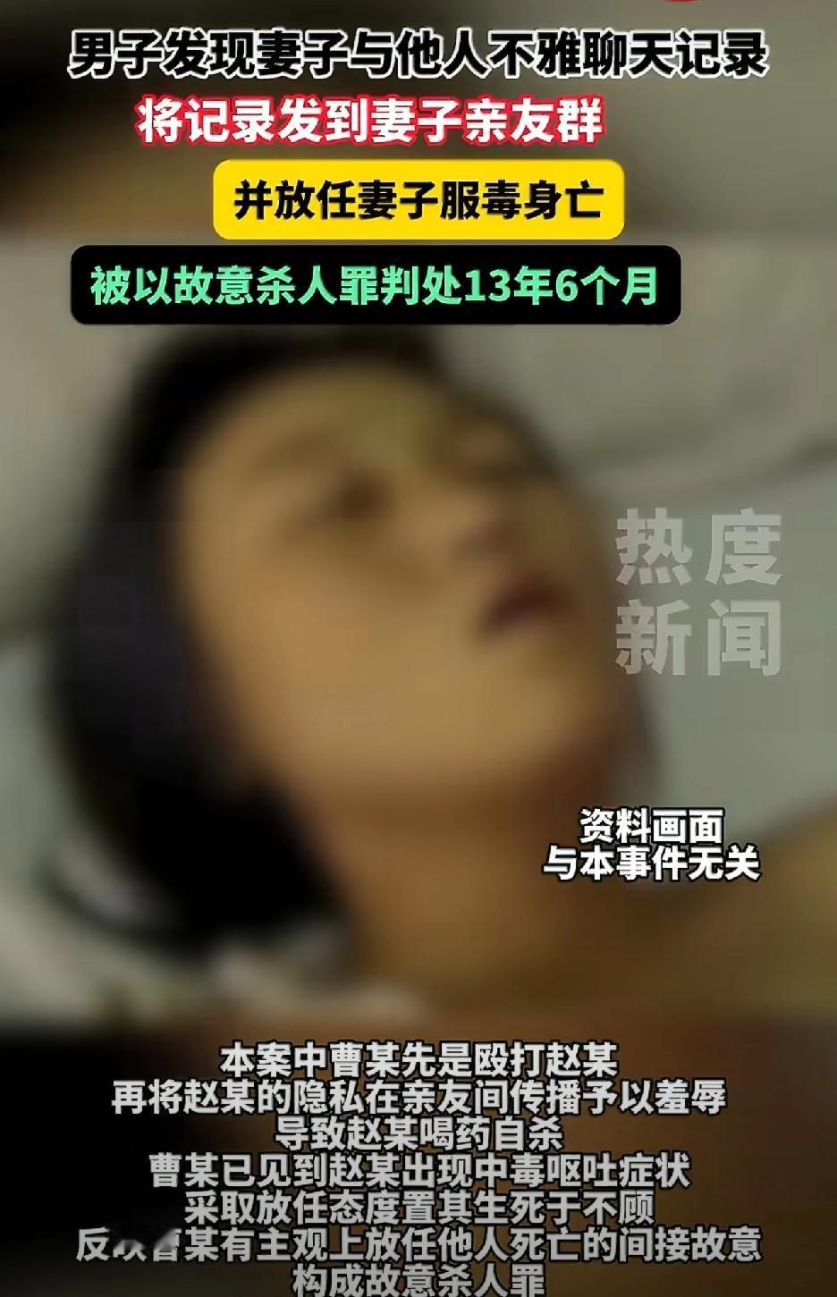 这个事情确实很难评,换你来估计你也不知道怎么做才是最合适的。 丈夫发现妻子的暧昧记录,然后把妻子给打了并且有言语辱骂,还把暧昧记录发到家族群,妻子觉得受不了然后喝农药自杀,丈夫在知道妻子已经中毒的情况下,没有采取任何措施,然后妻子抢救无效死亡,最终的结果就是男的因故意杀人罪被判了十三年六个月。男的的确应该被判刑,但是我觉得有点重了。 先说这个女的,属于出轨在先,跟别人暧昧不觉得羞耻,被发现以后受不了了,喝农药更是对自己生命的不负责。男的也是丝毫不理智,出轨只能算是道德层面的问题,你打人那可是违法的,发现老婆中毒了,不采取措施更是错上加错,毕竟人家又罪不至死,她有错在先,协商离婚才是最正确的措施,这下好了,把自己送进去了。 这个事情有点像把男朋友一脚踹进河里淹死的那件案子,区别在于她只算是过失杀人,最终是判了五年。 我还是那句话,出轨固然有错,但生命诚可贵,男的也挺冤枉的,怪也只能怪自己不够理智,最终落了个十三年的牢狱之灾,其实我觉得折中一下判个8-9年,我估计双方都能接受,不知道大家怎么看的?