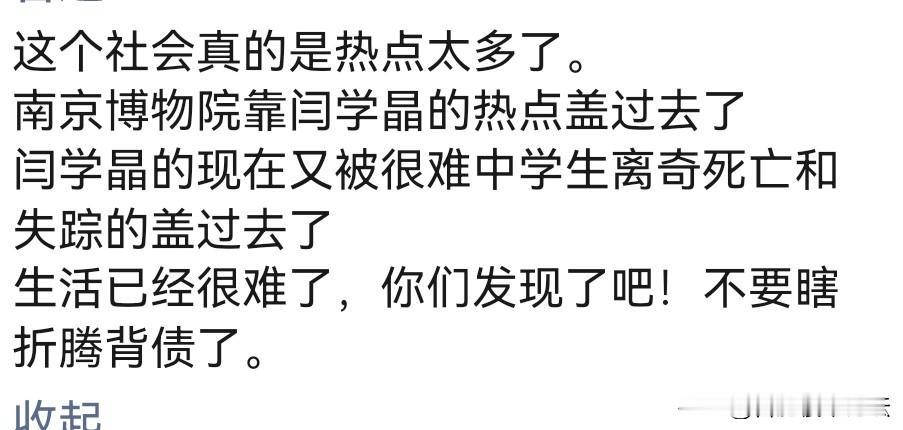 的确挺多热点的。 南京博物院的不知道咋回事,闫某人的来了。 闫某人的不知道咋回事,河南中学生离奇死亡的和失踪的来了。 的确生活不容易。