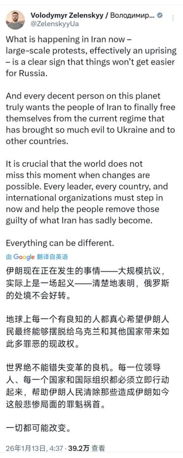泽连斯基北京时间1月13日写道:“伊朗现在正在发生的事情大规模抗议,实际上是一场起义清楚地表明,俄罗斯的处境不会好转。地球上每一个有良知的人都真心希望伊朗人民最终能够摆脱给乌克兰和其他国家带来如此多罪恶的现政权。世界绝不能错失变革的良机。每一位领导人,每一个国家和国际组织都必须立即行动起来,帮助伊朗人民清除那些造成伊朗如今这般悲惨局面的罪魁祸首。一切都可能改变。” 这背后最直接的原因,就是泽连斯基想报复伊朗。俄乌冲突打了这么久,伊朗对俄罗斯的支持可不是嘴上说说,全是真金白银和关键武器装备。 从战场上的情况就能看出来,伊朗给俄罗斯送了大量Shahed系列自杀式无人机,尤其是Shahed-136。 这种装备成本低、容易批量生产,成了俄罗斯打击乌克兰基础设施和军事目标的好用工具,让乌克兰吃了不少亏。乌克兰军队没办法,只能用宝贵又昂贵的防空导弹去拦这些廉价无人机,花了大代价却没什么效果,泽连斯基心里肯定记恨。 而且伊朗的援助不只是无人机成品。2024年的时候,伊朗还给俄罗斯提供了几百枚精准度很高的Fath-360短程弹道导弹。当时俄罗斯正缺弹药,这些导弹大大增强了俄军的远程打击能力,帮俄罗斯稳住了战场上的攻势。 更关键的是,伊朗还把核心技术都交给了俄罗斯,帮着俄方建了无人机工厂。到2025年,俄罗斯每个月都能造出2700架无人机,这背后全靠伊朗的技术支持。 为了感谢伊朗,俄罗斯甚至用黄金这种硬通货付款,单说无人机相关的交易,就涉及将近4吨黄金,价值超过2亿美元。从这些就能看出来,伊朗和俄罗斯的合作又深又广。 泽连斯基看着伊朗帮俄罗斯在战场上压着自己打,乌克兰这边一直被动,早就把伊朗当成了眼中钉。现在抓住伊朗国内有抗议的机会跳出来喊着要换政权,说白了就是借题发挥,报复伊朗支持俄罗斯。 再说说讨好美西方这回事,这才是泽连斯基说这些话的核心目的。现在的乌克兰,早就离不了美西方的援助了。武器、钱、外交上的支持,每一样都得看美西方的脸色。 最近这段时间,美西方正好盯着伊朗,还一个劲地加大压力。当地时间1月11日,美国总统特朗普就放话,说正在考虑包括军事行动在内的“非常强硬的办法”来应对伊朗局势。 他还说,伊朗一边想谈判,另一边也不排除会提前动手。欧盟也跟着表态,正在琢磨对伊朗实施更严厉的制裁,理由就是所谓的“暴力镇压抗议者”。 泽连斯基把这些看得明明白白,他知道这是向美西方表忠心、献殷勤的好机会。他心里清楚,只要跟着美西方的节奏骂伊朗、喊着要换伊朗政权,就能正好对上美西方的对伊策略,这样就能换来更多的援助和支持。 要知道,2026年1月初的时候,泽连斯基刚搞了一轮重大的权力调整,换了核心岗位的官员。新上任的总统办公室主任布达诺夫,在美国官员那里更受认可。 之后泽连斯基就带着他去了巴黎,和美国特使、特朗普的顾问见面会谈。他们这么做的核心目的,就是想保住和西方的外交联系,争取更多支持。 在这个节骨眼上,泽连斯基跳出来呼应美西方对伊朗的态度,就是想靠这种讨好的表演,向美西方证明自己还有用,巩固和他们的关系,确保援助不会断。 最可笑的是,泽连斯基还把伊朗国内的抗议说成是“起义”,把伊朗现在的困境都怪到现政权头上。这纯属颠倒黑白、歪曲事实。真实情况是,伊朗最近的抗议,主要是因为物价涨得厉害、货币贬值这些经济问题。 而这些经济困难的根源,正是美西方长期的非法制裁。2018年美国单方面退出伊核协议后,就对伊朗实施了全方位的制裁。这直接导致伊朗货币贬值、通货膨胀严重,经济发展受到了毁灭性的打击。 而且伊朗政府已经明确表示,会重视民众的诉求,下定决心解决经济困难。他们还组织了全国性的“抵抗游行”,几十万民众走上街头,谴责外国势力支持的骚乱,表达对国家的支持。 国际社会大多都反对干涉别国内政,中国外交部也明确表态,希望伊朗政府和人民能克服困难、保持稳定,反对使用武力或者威胁使用武力,还呼吁各方多做对中东和平稳定有利的事。就连美国国内,也有不少人反对对伊朗动武。 他们觉得,要是对伊朗发动军事打击,只会让伊朗民众团结起来反对美国,历史上美国对外干预的教训已经够深刻了。 泽连斯基不管这些基本事实,把一场由经济问题引发、还有外国势力干涉背景的骚乱说成是“起义”,还喊着让国际社会介入,推动伊朗换政权。 他这么做全是为了自己的投机目的,根本不管伊朗的国家主权,也不顾中东地区的稳定。 说到底,泽连斯基说的这番话,没有一点真心实意的正义关切,全是围着自己的利益盘算。一边是报复伊朗帮俄罗斯给自己带来的战场压力,一边是讨好美西方换取更多援助。