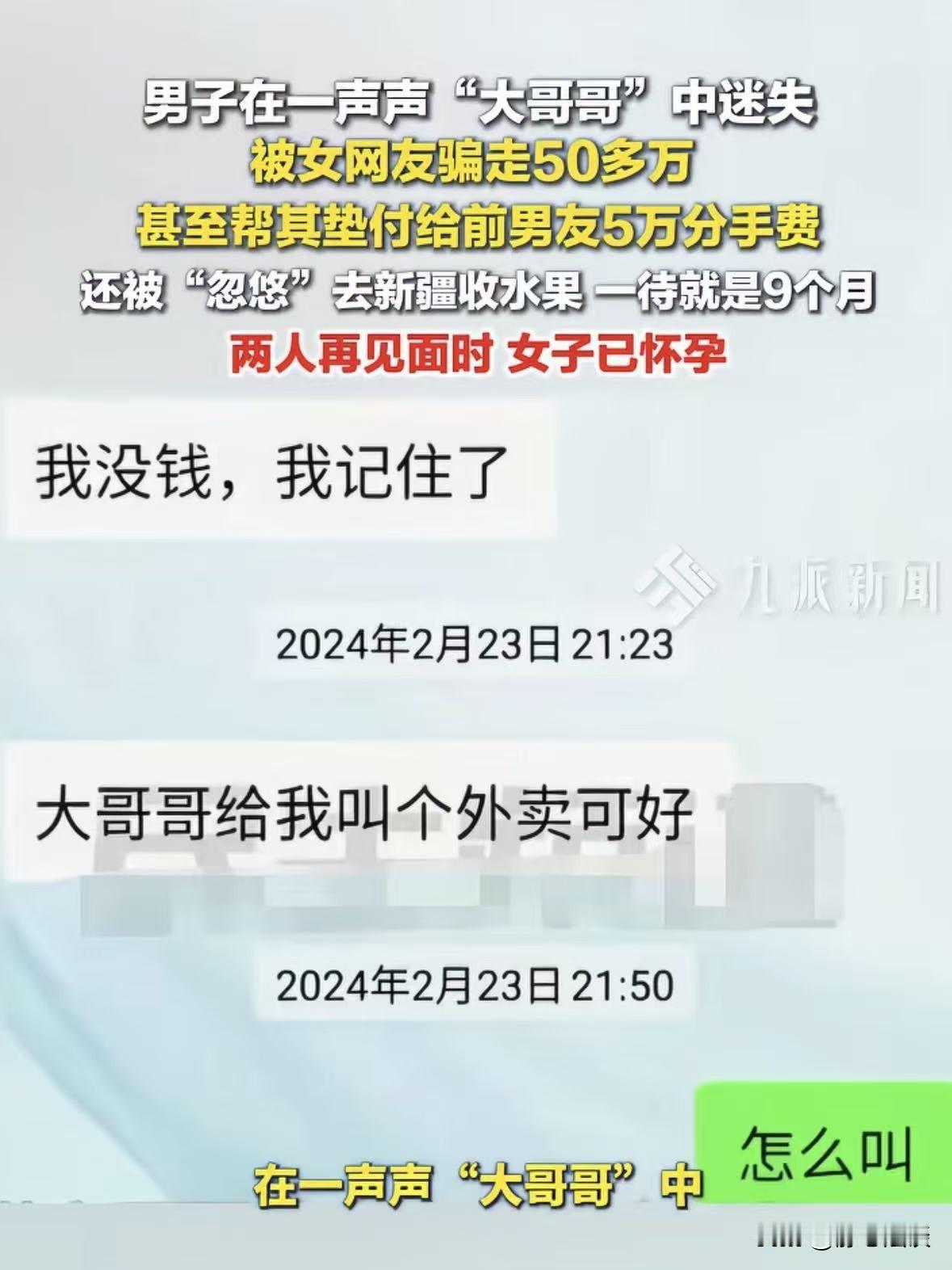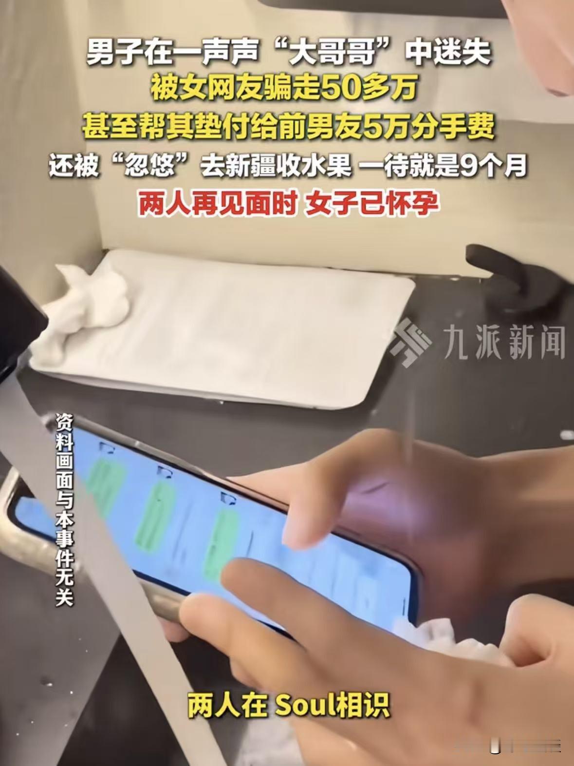 内蒙古,41岁男子在交友软件上结识女网友,奔现后被一声声大哥哥叫的昏了头,为其花钱吃饭,给女友的孩子买奶粉尿不湿,还要花钱请保姆,还贷款50多万让她做生意,一共花了快60万,让他他没想到是,女友让他出去收水果,男子一走就是9个月,回来后发现女友又怀孕了,孩子还不是他的,男子崩溃,觉得女子一直在骗自己,随后报警,要求她还钱,后来女子写了一张55万的欠条,随后失踪,怎么都联系不上,目前已经立案! 郑先生今年41岁,2024年的时候在交友网站上结识了一位女网友。 对方主动加郑先生的联系方式后,两人便频繁聊天。 一开始,女网友说话温柔,还特别会关心人,每天嘘寒问暖,一口一个大哥哥叫着,叫得郑大哥心里暖洋洋的。 聊了一段时间后,女网友以没钱吃饭为由,管郑先生接了500块钱。 郑先生作为内蒙古的汉子,重情义,遇上看着顺眼的人,掏心掏肺都觉得不算啥。 而且500块也不多,他想都没想就转过去了,虽然两人还没确定关系,但是已经聊的很投缘了。 可万万没想到,这仅仅是个开头,女网友的难处越来越多。 没过几天,她又说自己前男友跑了,刚生完孩子,连出院的钱都没有,让郑先生再帮帮她。 郑先生一听,对方还有个孩子,日子过的得多难,二话不说又转了一笔钱。 接下来,孩子的奶粉、尿不湿,女子又说带孩子忙不过来,要请保姆,郑先生又拿了3万请保姆钱。 女子看郑先生这么大方,这么体贴,顺势提出要和他处朋友,表述跟他在一起,特别安心。 这话一出,可把郑先生乐坏了,他这辈子就盼着有个家。 如今心上人主动开口,他恨不得把心都掏出来。 两人就这样顺理成章地确定了关系,郑先生更是把男人要多承担这句话刻在了心里。 随后女子又说前男友缠着她,要5万块钱分手费,不然这事就没完。 郑先生脑子一热,觉得自己的女人自己疼,眼也没眨就给就掏了5万块钱。 郑先生觉得自己作为男人,就该多承担一些,既然对方选择了自己,不管提什么要求,他都尽量满足。 在一起之后,郑先生对女友更是掏心掏肺。 给她买了两个手机花了1万6,买首饰又花了3万。 在他看来,这些都是为了两个人的好日子,花得值。 后来女子提出想做点小生意,以后多赚点,俩人日子也能好一些。 郑先生一听,觉得女子有上进心,俩人心往一处使,日子肯定能越过越好,心里更是充满了期待。 可当时郑先生手里的积蓄已经花得差不多了,一时之间根本拿不出那么多钱。 为了满足女子的心愿,最后贷款了50万,全部拿去给女子开店。 钱刚到位,女友就跟他说,店里需要稳定的货源,让他去外地收水果,等店走上正轨,俩人就领证结婚。 一句结婚的承诺,让郑先生彻底放下了所有顾虑。 他收拾好行囊,满怀期待地踏上了收水果的路,谁知道这一去就是9个月。 9个月后,郑先生风尘仆仆的赶了回来,回来竟然发现女子怀孕了,孩子不知道是谁的! 后来郑先生才得知,他投进去那些开店的钱,压根就没有开。 这时侯,郑先生这才如梦初醒,意识到自己可被骗了。 他回想起这一年多来的点点滴滴,女友一次次要钱的理由,一次次的承诺,现在想来,全都是破绽。 想明白这一切的郑先生,彻底崩溃,他半生积蓄没了,还背上了50多万的贷款,付出了真心,却换来这样一场骗局。 随后郑先生便报了警,在帽子叔叔的见证下,女子给郑先生写了一张55.3万元的欠条,承诺会还钱。 可欠条刚写没几天,女子就像蒸发了一样,怎么都找不到。 好不容易联系上女子的弟弟,被告知其弟弟也在找她。 弟弟表示姐姐一句实话没有,连他的钱都被骗没了,现在要是能找到姐姐就好了。 实在走投无路的郑先生,最后只能选择报警。 目前,警方已经立案侦查,认定该女子涉嫌合同诈骗,符合刑事立案标准,已经立案侦查。 《刑法》第266条:骗公私财物,数额较大的,处三年以下有期徒刑、拘役或管制,并处或单处罚金。 数额巨大或有其他严重情节的,处三年以上十年以下有期徒刑,并处罚金。 数额特别巨大或有其他特别严重情节的,处十年以上有期徒刑或无期徒刑,并处罚金或没收财产。 可郑先生心里也清楚,就算找到了人,这50多万能不能追回来,还是个未知数。 现在,郑先生每天都在为这笔巨额欠款发愁,一边要应对贷款催收,一边还要配合警方调查,日子过得十分艰难。 这事也给所有人提个醒,不管是男人还是女人,网上交友一定要谨慎。 隔着屏幕,你永远不知道那头的人,是真心待你,还是揣着一颗算计你的心。 不要轻易相信别人,更不要随便给对方花钱,免得像他一样,落得个人财两空的下场。 毕竟人心隔肚皮,别让自己的善良和实在,成为骗子下手的理由,别等到人财两空的时候,才追悔莫及。 对此,你怎么看这件事? @静心法谈 学法辨是非,慬法不吃亏。