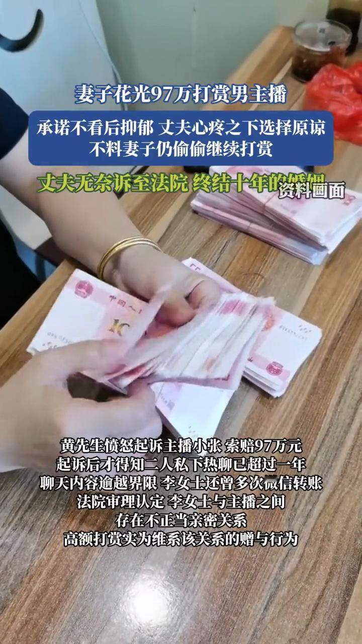 妻子花光97万打赏男主播,承诺不看后抑郁,丈夫心疼之下选择原谅,不料妻子仍偷偷继续打赏,丈夫无奈诉至法院终结十年的资料画面。 1月12日报道,上海黄先生发现妻子李女士愈发不愿和自己说话,整日沉迷于男主播小张的直播。此后他在家中发现借条,李女士起初称是临时用钱找亲戚周转,黄先生追问家中几十万存款去向,李女士瞒不住才坦白钱已全部打赏耗尽。 虽然李女士承诺不再看直播,却因此情绪低落,确诊抑郁,黄先生心疼之下选择原谅,不料她仍偷偷继续打赏,累计金额近百万元。黄先生愤怒起诉主播小张索赔97万元,起诉后才得知二人私下热聊已超过一年,聊天内容逾越界限,李女士还曾多次微信转账。 法院审理认定李女士与主播之间存在不正当亲密关系,高额打赏实为维系该关系的赠与行为,李女士未经丈夫同意擅自处分大额夫妻共同财产,损害了黄先生权益,该赠与行为无效,扣除平台分成与税费后主播实际收益为28万元,叠加微信转账金额,法院最终判决小张返还黄先生30余万元。事后黄先生与李女士结束了十年的婚姻。
