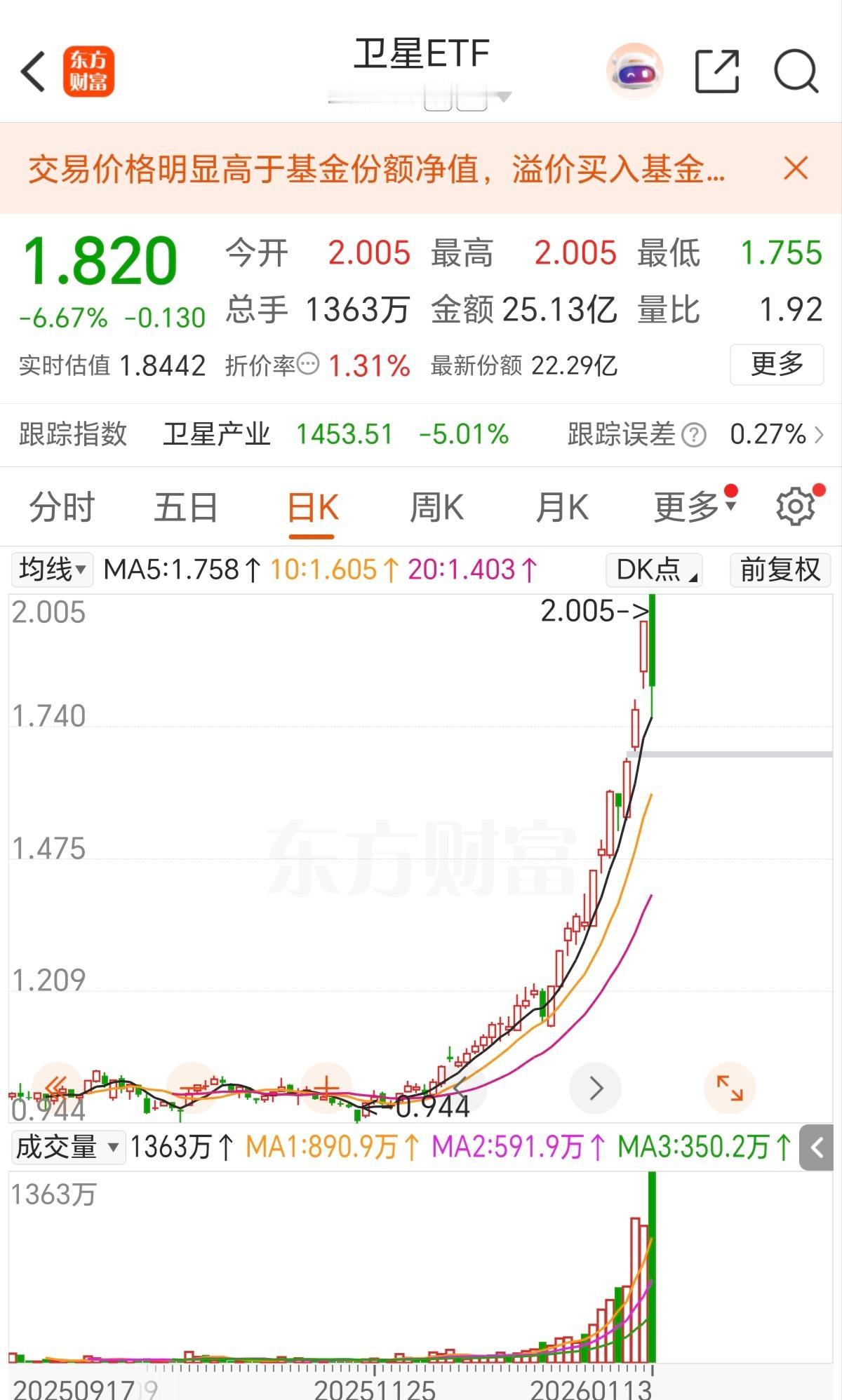 昨天追高进入卫星ETF的,或者今天早上追高进去的,一天就亏损20个点,直接闷杀,特别是上杠杆的资金,这下进退两难了,卖了亏损巨大,一天就亏了20个点,不卖,这波短期调整估计要一段时间了,还得承担继续下跌的风险,这就是盲目跟风的下场。