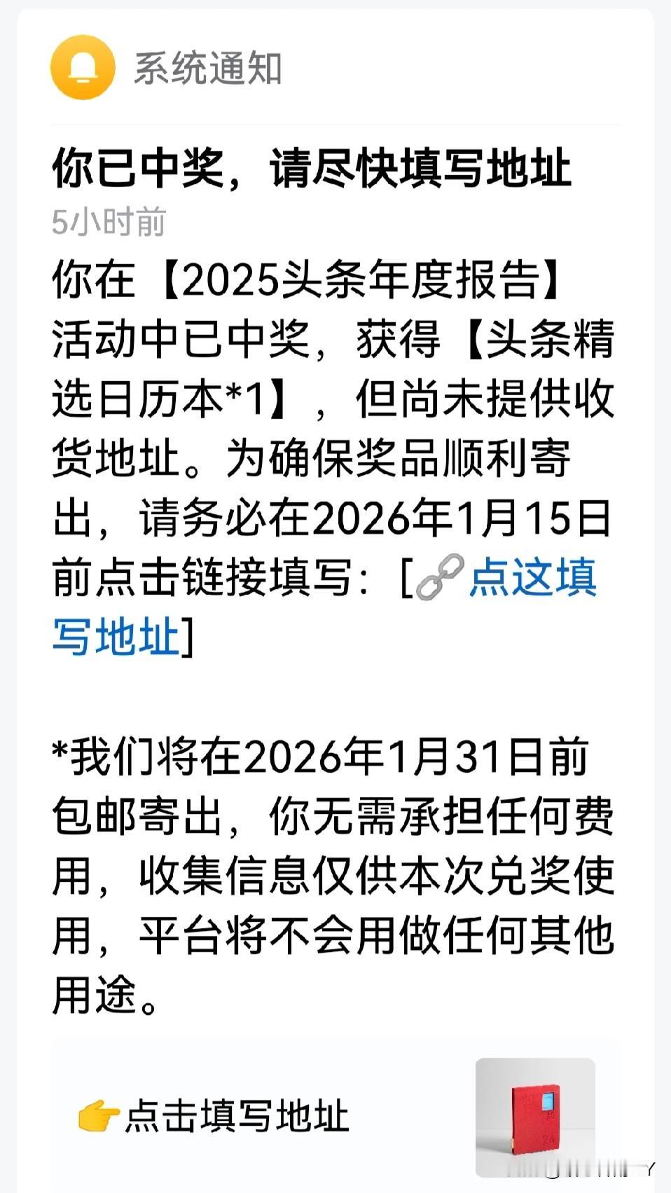 头条突然送来中奖通知,起初满心期待能中个大奖,点开一看,原来是年度专属纪念日历! 虽说奖品不算贵重,但礼轻情意重,这份惦念太动人,瞬间心里暖暖的,果断填好收货地址,坐等发货…… 有没有和我一样中奖的友友,咱们一起坐等这份小惊喜,也沾沾这份好运气呀!