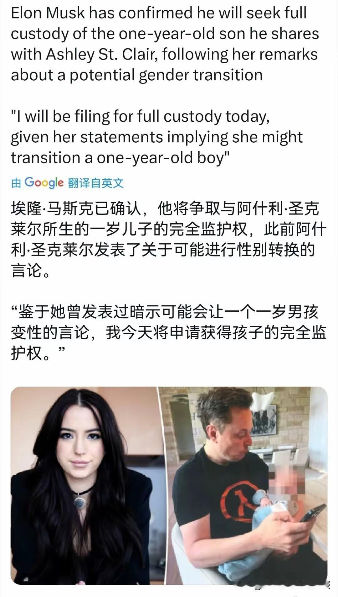 世界首富马斯克也有用金钱解决不了的烦恼啊!马斯克现在大概最恨美国的教育了。他说他将争取他1岁小儿子的完全监护权,原因是他这位生孩子的女友之前发表过可能让儿子转性别的言论。马斯克的大儿子已经变成长发飘飘的女孩了,她哪能忍受小儿子也走上这条路呢? 前两天看到华人数学天才陶哲轩之子变非二元性别,留着一头长波浪头发,在镜头前和父亲一起探讨AI如何与人类合作。陶哲轩研究了一辈子数学,却也改变不了儿子变性别的结局,只能选择尊重。 特朗普上台后虽然很努力地重拳出击这股歪风,但仍有很多人还是执着于所谓的“性别自由”,将个人选择凌驾于普遍认知之上,全然不顾这种思潮对未成年人成长可能埋下的隐患。