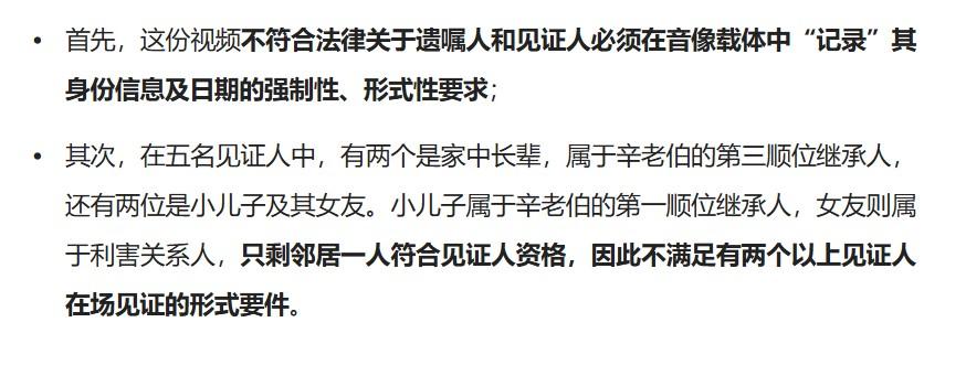 现有证据很难说是老人录遗嘱是不是真实意愿的表示,也不能确定老人是什么时候、在什么情况下录的遗嘱,所以法院判决无效。老人录像遗嘱最好要有公证,如果没有至少也要有两个以上没有关系的证人;而这个老人录像遗嘱时现场主要是继承人,只有一个邻居没有利害关系。另外,录像中也没有时间和见证人个人信息,女儿看来是懂得法律的,也知道自己照顾老人如何。实际上,就是子女之间的遗产争夺战。