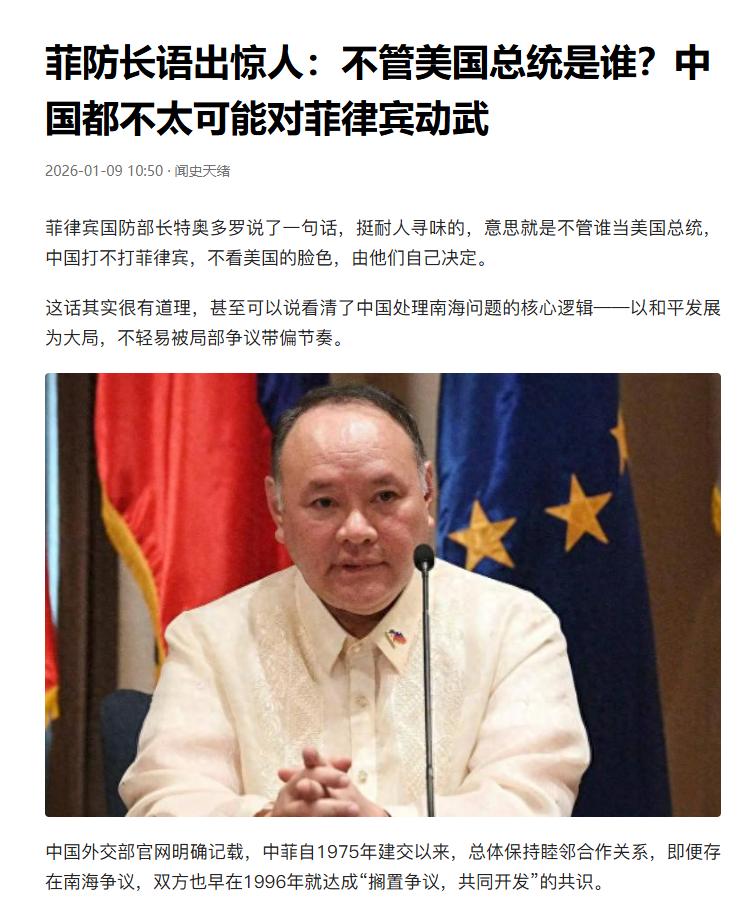 菲律宾国防部长吉尔伯特·特奥多罗称:不管美国的总统是谁?中国都不太可能对菲律宾动武。 特奥多罗的言论,多少有些傲慢和无知了,在他的认知中,不管菲律宾怎么胡闹,中国都只会通过外交途径解决,而不会对菲律宾动武。 他不知道的是,中国之所以目前没有对菲律宾动武,是因为中国是一个奉行和平的国家。 中国拥有14亿人口,200多万军队,而且还是拥有核武器的大国,海军更是已经有3艘航空母舰在服役了。 而菲律宾的人口只有1亿,军队也只有12万多人,航空母舰和核武器等,更是不存在的。 然后中国与菲律宾也是邻国,中国的舰长礁距离菲律宾巴拉望省仅约80公里。 如果中国真的想对菲律宾动武,是非常容易的事情,但是中国并没有这么做。 也可能是中国的克制,给了特奥多罗误判,他以为菲律宾有美国的支持,中国就不会对菲律宾动武。 特奥多罗需要知道的是,中国维护自己的领土完整的决心是不会变的,如果菲律宾继续在错误的道路上行驶,威胁到中国的领土安全,中国也不是没有对菲律宾动武的可能。 而对不对菲律宾动武,主动权完全在中国一边。能不能导致中国对菲律宾动武的主动权,则在菲律宾一方。 如果菲律宾能不再追随美国,故意挑衅中国,而是尊重中国的领土主权,与中国一起搞合作,那么菲律宾将会有一个更好的未来,中国也没有必要对一个与中国保持友好的国家动武。 而且中国目前是菲律宾的最大贸易伙伴和第一大进口来源地,截止2024年,双边的贸易额更是达到了716亿美元。 所以从经济发展和军事不对等来看,菲律宾不与中国作对,而是与中国搞合作,都是最好的选择。 以上内容在参考今日头条作者:闻史天绪,发表的文章:菲防长语出惊人:不管美国总统是谁?中国都不太可能对菲律宾动武,基础上创作。