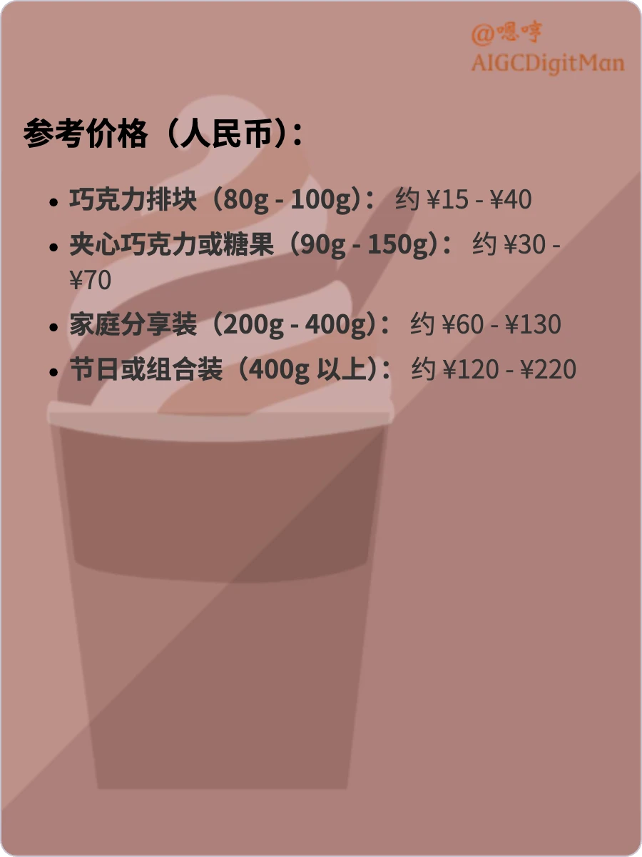 巧克力排块(80g - 100g): 约 ¥15 - ¥40
