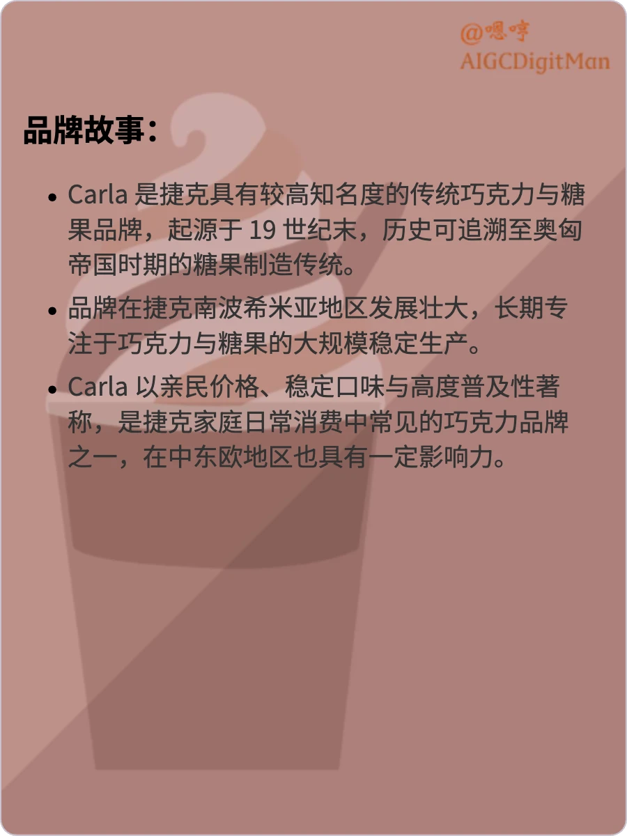 Carla 是捷克具有较高知名度的传统巧克力与糖果品牌,起源于 19 世纪末,历史可追溯至奥匈帝国时期的糖果制造传统。