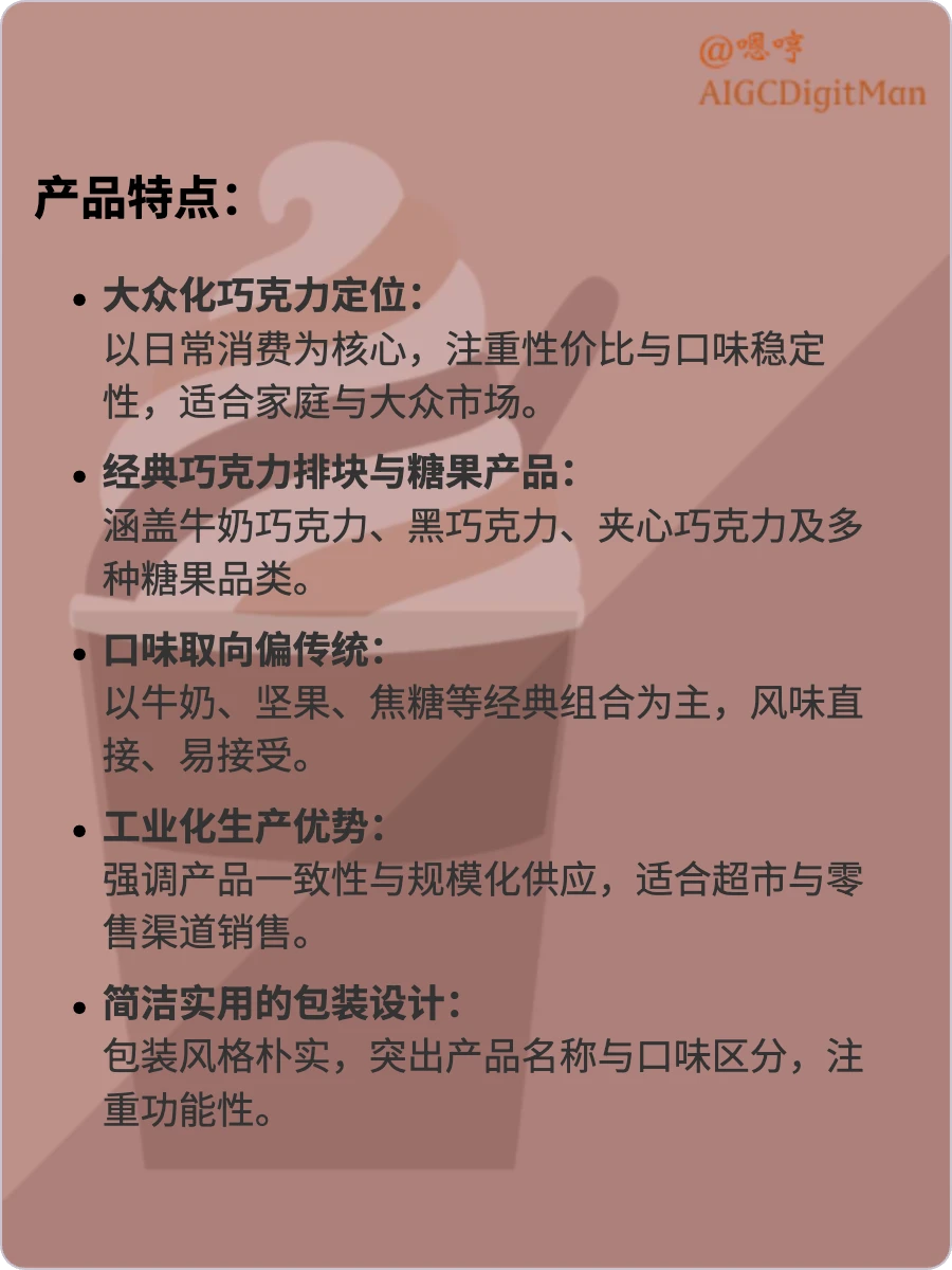 大众化巧克力定位: 以日常消费为核心,注重性价比与口味稳定性,适合家庭与大众市场。