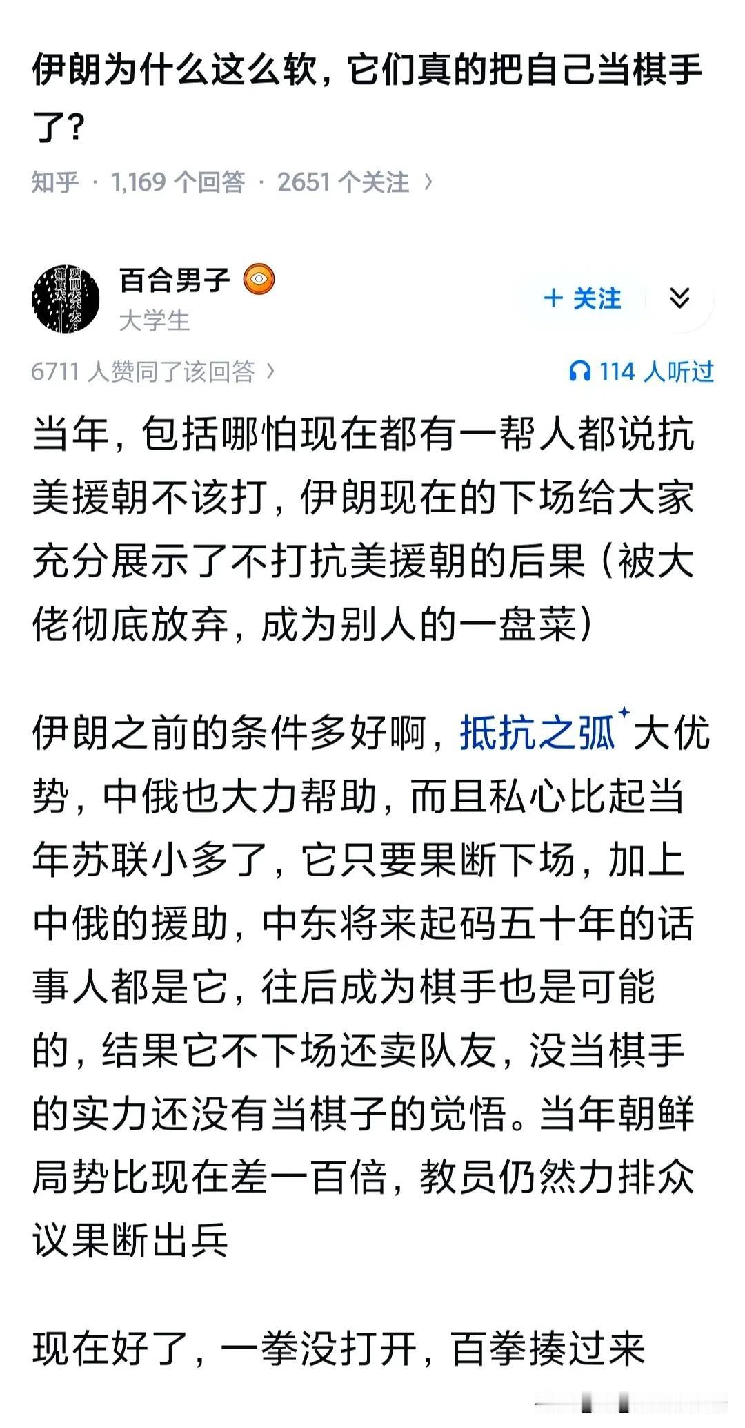不要把伊朗人当做大国人。 大家都有个先入为主的错误观点,就是觉得伊朗人可以奋发图强,可以血战一场来维护尊严,这是错误观点。过去上百年来,也就是咱们志愿军,完成了不可能完成的抗美援朝胜利。 但这只是个例和特例,不能当做普世例子来看的。强如英法美等国家,也做不到志愿军的能打,你让伊朗军队学习志愿军? 两伊战争打了八年,伊朗和伊拉克拿着世界最先进的武器,打了一场中世纪的战争,还打了平手,你还指望什么?美国打了两次伊拉克,请看伊拉克军队的表现多差。关键是伊朗军队也不比伊拉克军队强,那你还能指望伊朗军队打的比伊拉克军队强吗? 所以现在的伊朗,已经是他们能够拿的出来的最强表现了,再也上不去了。因为伊朗只有这个水平,你还指望伊朗有当年志愿军的水平?先入为主也得对标个差不多的榜样。伊朗军队可以对标伊拉克军队,但决不能是志愿军。 连美军都对标不了志愿军,你还让伊朗军队去对标,也太难为人了吧。 所以看到好多夸夸其谈去指责伊朗,完全是纸上谈兵,清楚伊朗情况吗?伊朗不是世界强国,伊朗军队也不是世界很强的军队。还想伊朗军队完成绝地逆转改变,想的太多了。 伊朗总体来看,已经将自己的局势,全力控制了,还可以与老美互相威胁,已经做到不错了。还想让伊朗打赢老美军队,你不觉得这也太难为人了吧?
