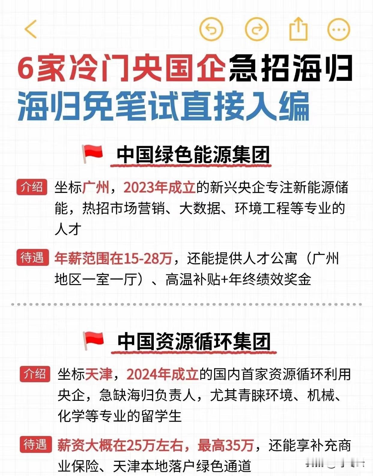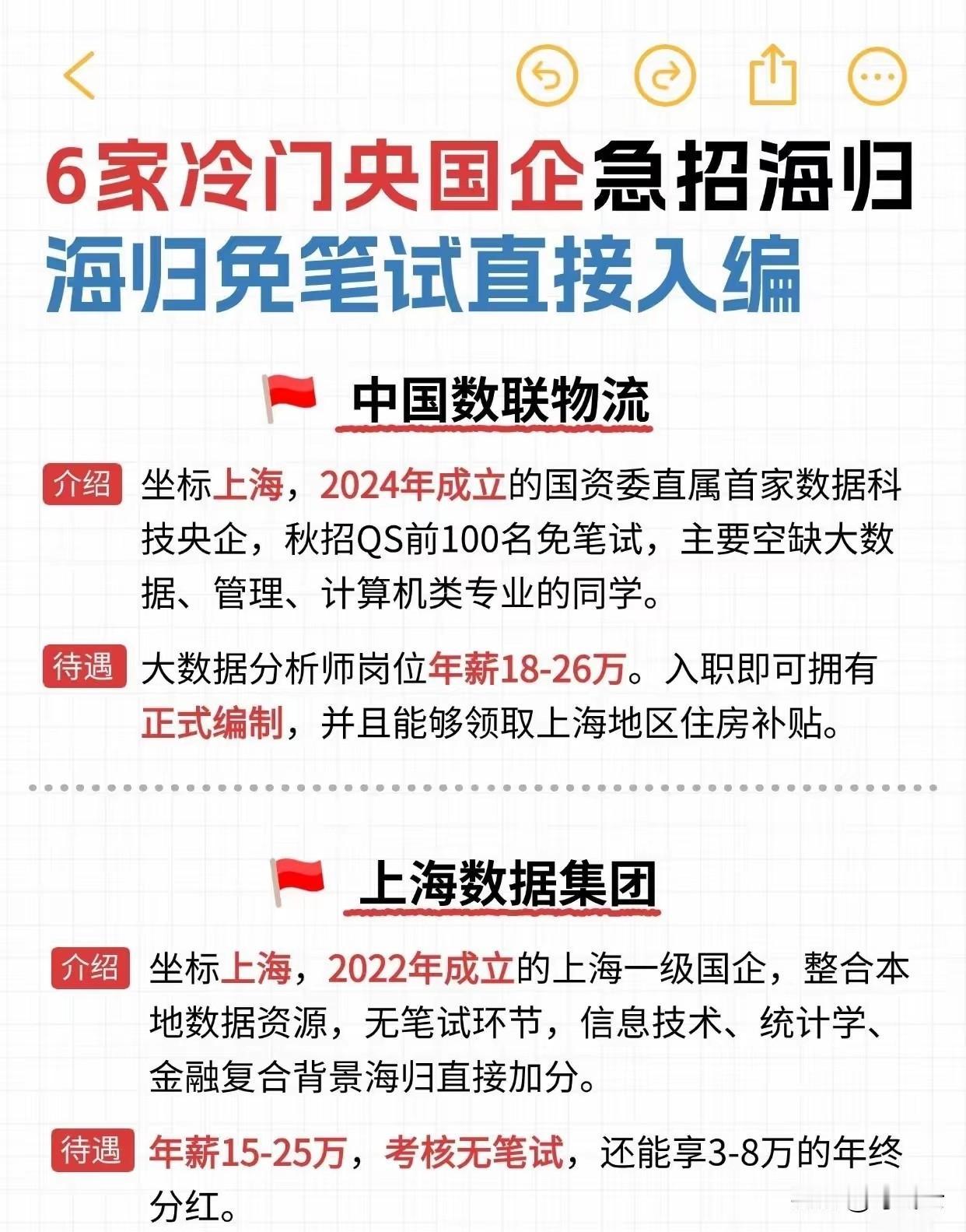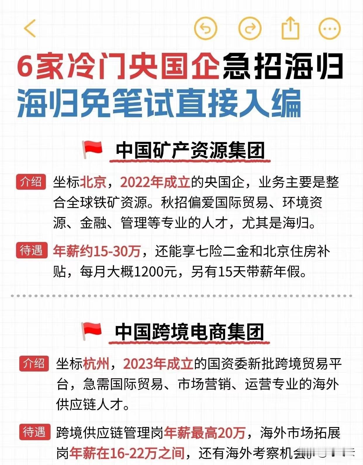 高薪急招!6家央国企紧急招聘要求汇总揭秘!赶快收藏起来备用!核心岗位,薪资15~25万,根据岗位情况,优秀者高达35万!海归硕士竟然免笔试直接入编!北京、天津、广州、杭州、上海等城市可以有选择。中国矿产资源集团,中国跨境电商集团,中国绿色能源集团等等,都是大平台,岗位薪酬有优势,福利待遇非常好!速速围观揭秘详细内容![招财进宝][招财进宝][点亮平安灯][点亮平安灯] @叮咚云 将优先为粉丝职业规划指导,1对1咨询是付费服务,为你定制最适合的就业择业方案!欢迎留言交流讨论。[来看我][来看我] 免责声明:图片来自网络,仅供参考! 央国企求职 国企招聘国企招聘 央国企求职