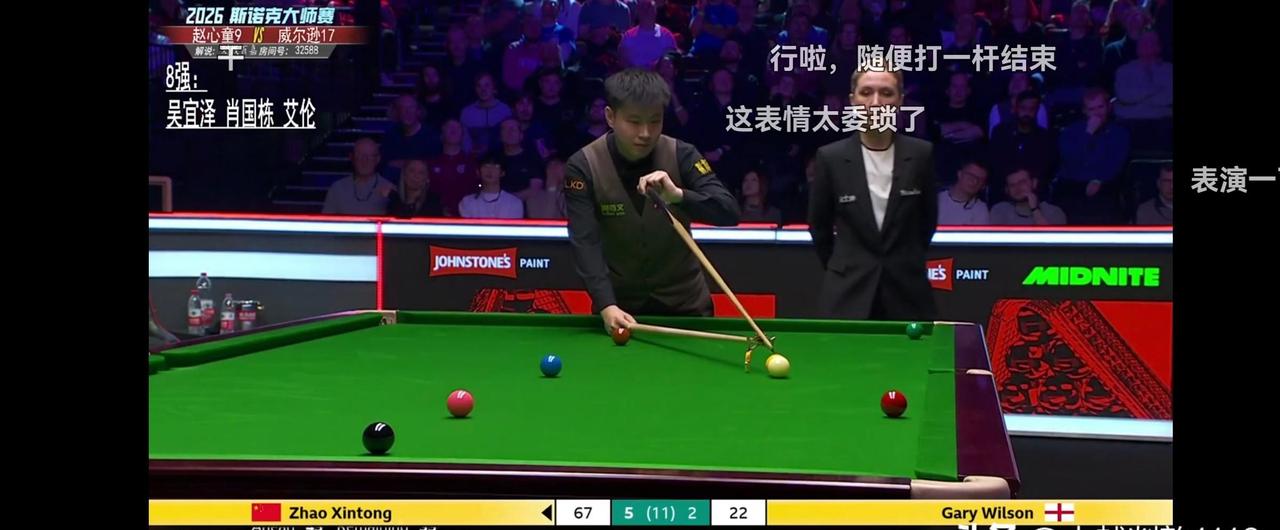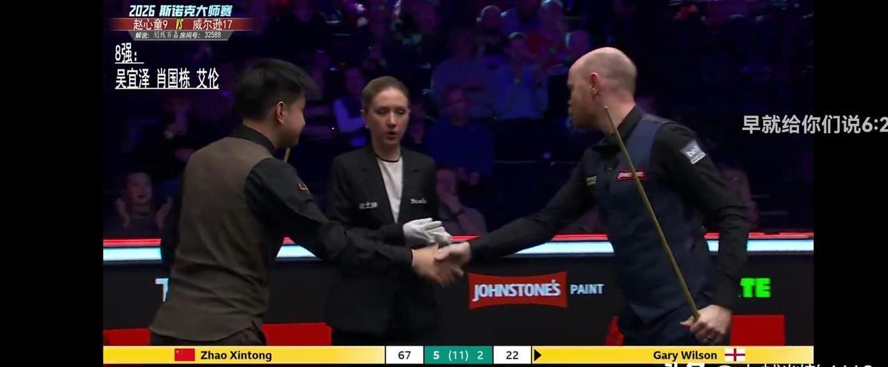 斯诺克大师赛战况速报:赵公子6:2轻取加里.威尔逊! 加里·威尔逊单杆76分先声夺人时,恐怕没人想到赵心童会用四杆50+的攻势扭转战局。 这场原本胶着的较量,最终以6:2的比分划出清晰的胜负线,而这已经是中国军团在本届大师赛打出的第三个6:2。 首局威尔逊的长台进攻如手术刀般精准,76分的破百让现场观众发出惊叹,但赵心童没有给对手延续手感的机会,第二局就用单杆53分还以颜色。 接下来的三局他仿佛找到了击球节奏,58分、62分、55分的连续得分让比分一路来到4:1,球台上的红球散落位置几乎都成了他的得分地图。 当威尔逊以66:7扳回一局时,现场解说都在讨论是否会出现逆转,赵心童却用一杆61分的关键清台稳住局势,第七局更是以67:22的绝对优势锁定胜局。 他在赛后采访时说,"第四局那个难度红球打进后,感觉整个球台都变得开阔了"。 这种打开局面的能力,在中国军团其他选手身上同样可见,吴宜泽面对"大嘴"墨菲时,同样用6:2的比分让对手提前握手;肖国栋对阵"塞大师"塞尔比,更是在关键球处理上展现出超越年龄的沉稳。 三位中国选手用相同的比分晋级,让本届大师赛八强席位里出现了罕见的中国红。 要知道斯诺克三大赛向来被英伦选手垄断,中国选手能在大师赛这样的顶级赛事中集体爆发,背后是梯队建设的厚积薄发。 从丁俊晖开创先河到如今赵心童、吴宜泽等年轻选手接棒,中国斯诺克正在完成从"独苗"到"军团"的转变。 赵心童手握英锦赛冠军,距离三大赛金满贯只差大师赛和世锦赛,这次晋级无疑让球迷看到了希望。 现在大师赛八强已产生半数,中国选手占据三席的格局让后续赛程充满看点,赵心童下一轮将迎战马克·威廉姆斯,两位以进攻见长的选手相遇,或许会奉献更多单杆高分的精彩对决。 当赵心童在第六局用架杆完成那颗贴库红球时,场边观众的掌声已经说明,属于中国斯诺克的新时代正在到来。