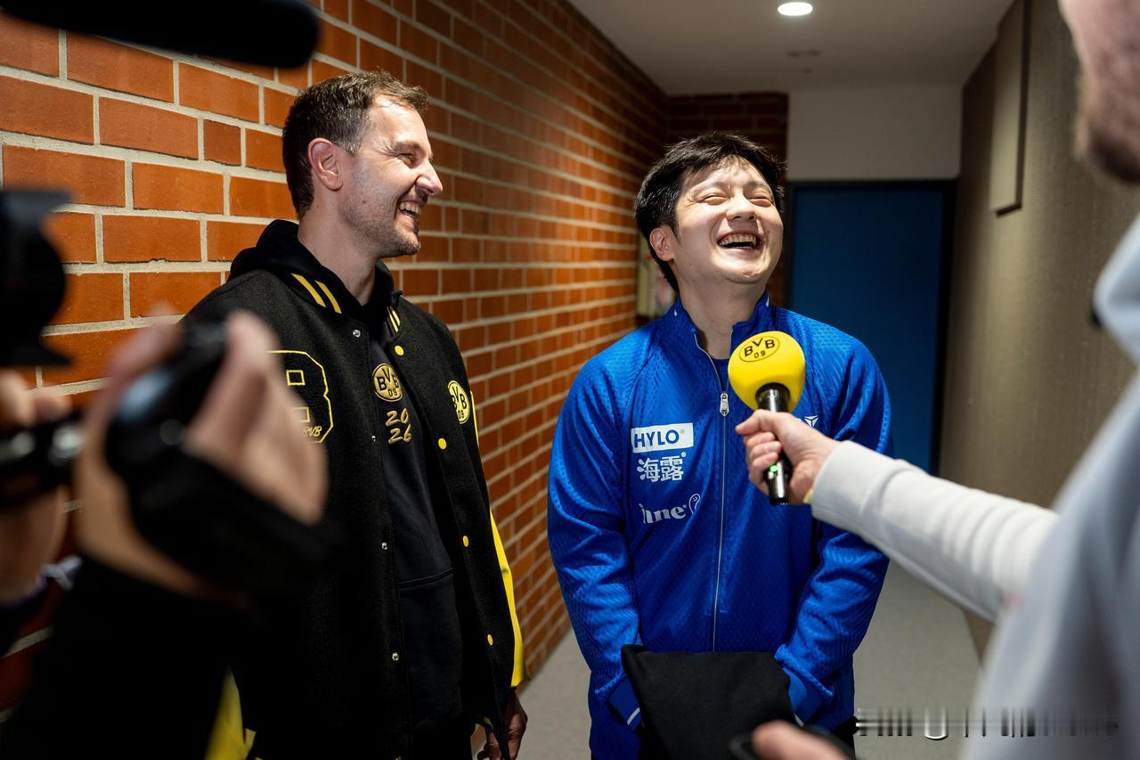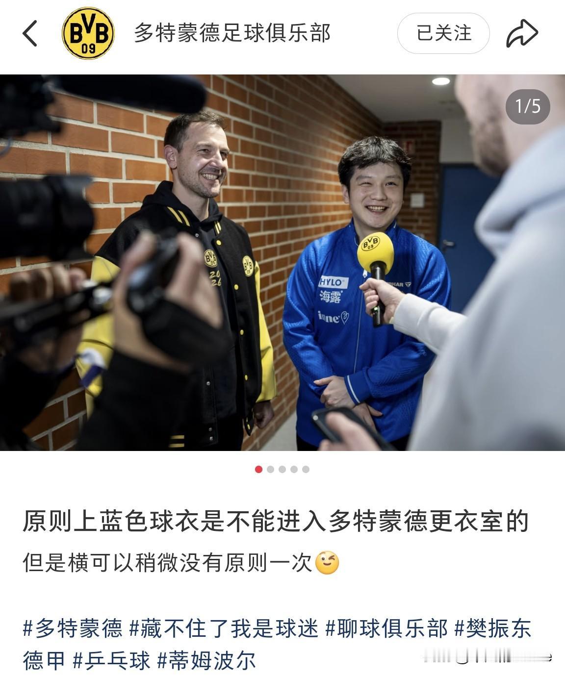 1月13日,多特蒙德足球俱乐部发文说:“原则上蓝色球衣是不能进入多特蒙德更衣室的,但是横可以稍微没有原则一次”。 为什么这位穿蓝色球衣的乒乓球运动员能进入对方球队的更衣室呢?因为他是樊振东。 樊振东接受了多特蒙德足球俱乐部的赛后采访,他的好友波尔是该俱乐部的品牌大使。 不知道记者问了樊振东什么问题?东东笑开了花,等采访片段发出来后,我一定要仔细观看。 今天,多特蒙德足球俱乐部的官微小编异常活跃,一个平台就发了10条动态,每条动态基本都有波尔和樊振东的身影,这就是东东的影响力。 国家队在WTT多哈冠军赛接连丢了两个项目的单打冠军,樊振东和林高远却只能前往德国打球,他俩还有机会出现在国际大赛的舞台上吗?
