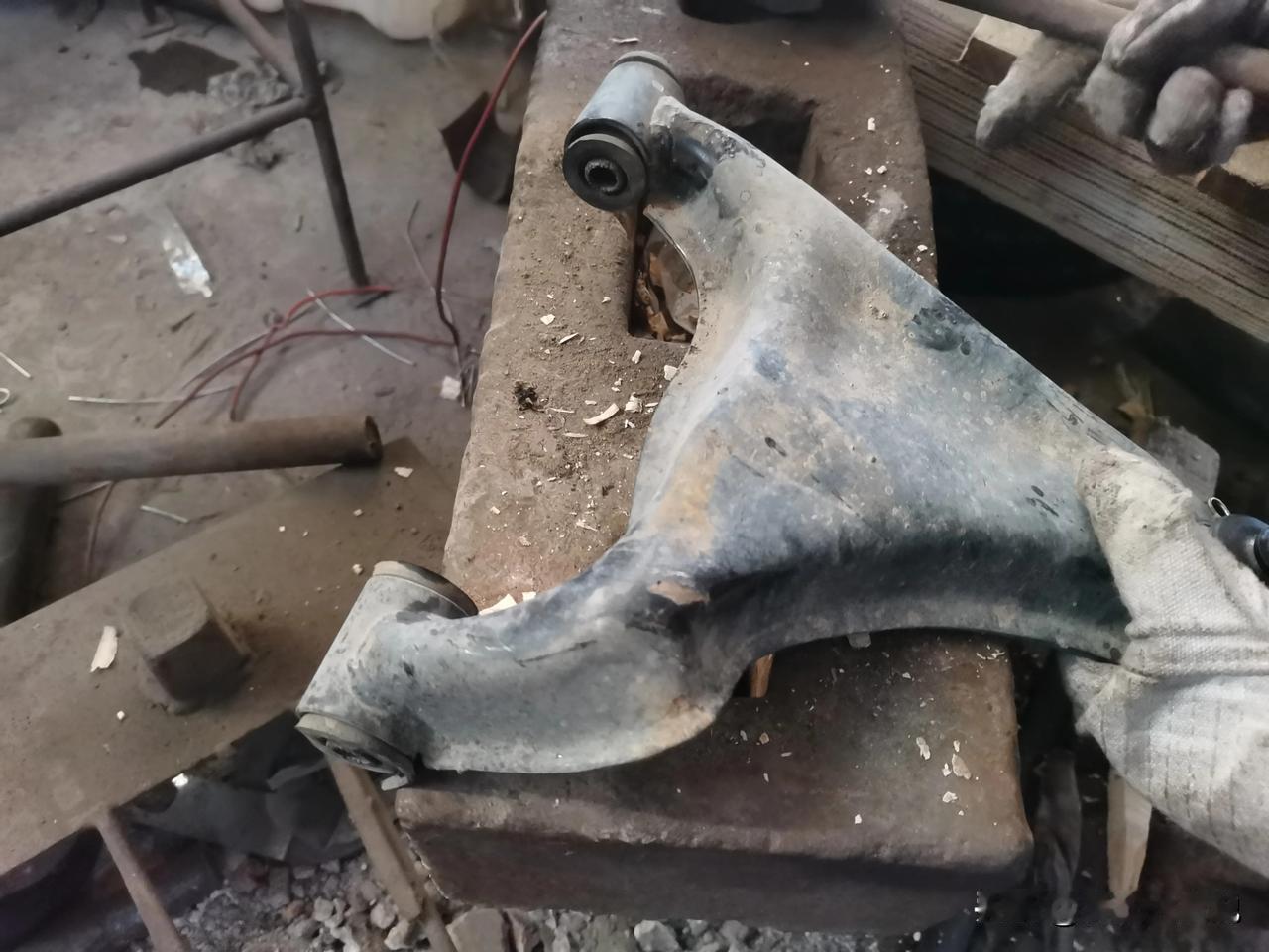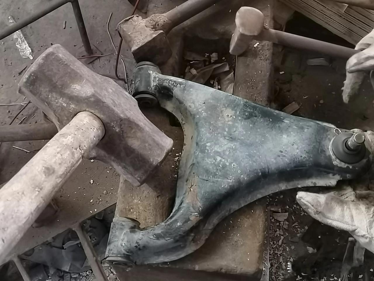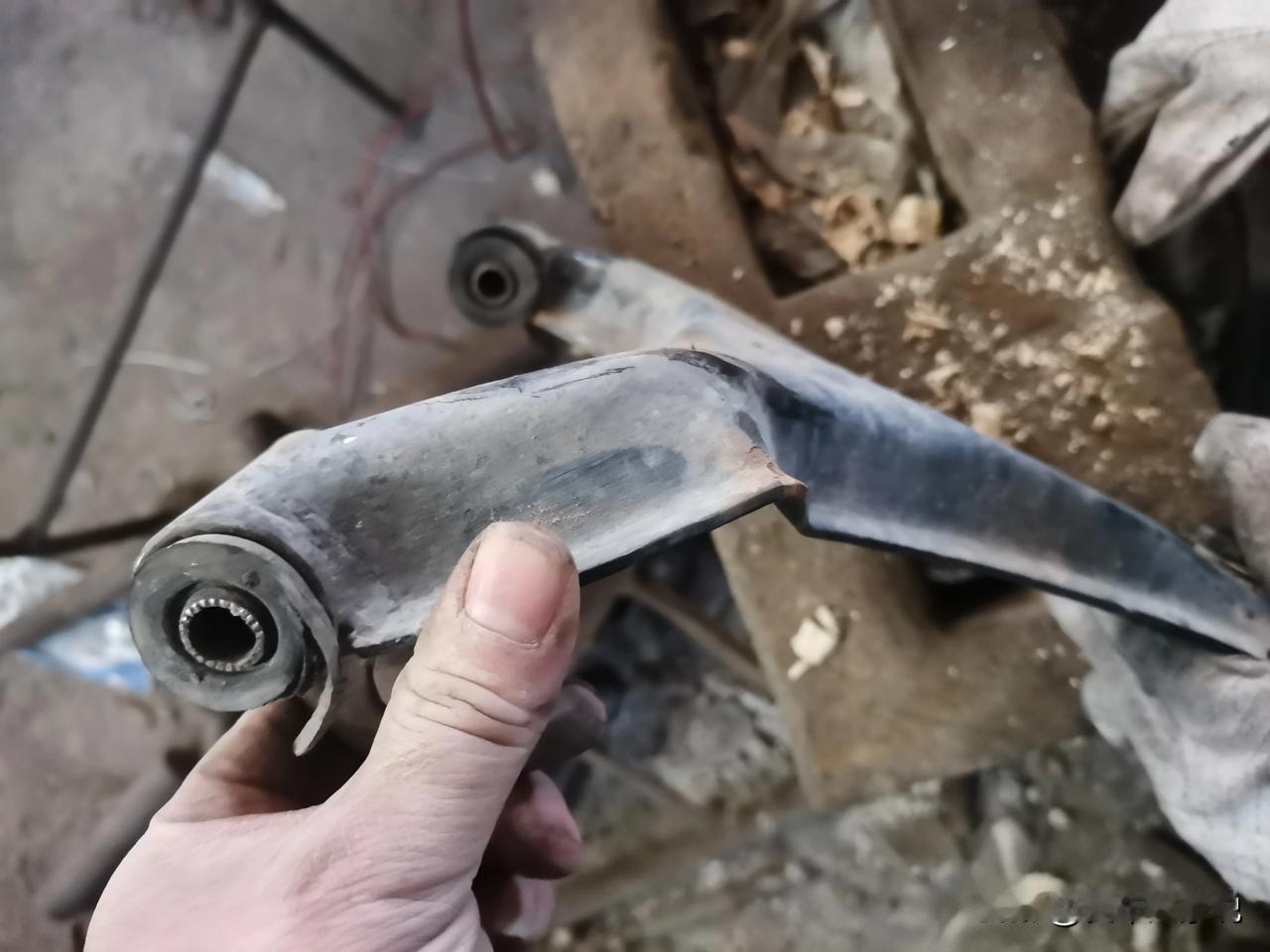 大阳巧客四轮车,右前轮撞面包车上了,下支臂直接撞成麻花,拆下来大小锤一通砸,基本上复原了。 为啥不换新的?主要是觉得没必要。因为撞击后不仅是下支臂变形了,车架子也有变形。众所周知悬挂上各个零件的配合尺寸差一点点都会影响四轮定位的精准度,所以要想恢复到原车状态需要的工程量太大了。拿尺子测量着,自己敲敲打打基本上都能恢复个八九不离十了。再加上这车速度也不高,即使有一点偏差影响几乎没有,修完开了一圈,实际效果非常好。