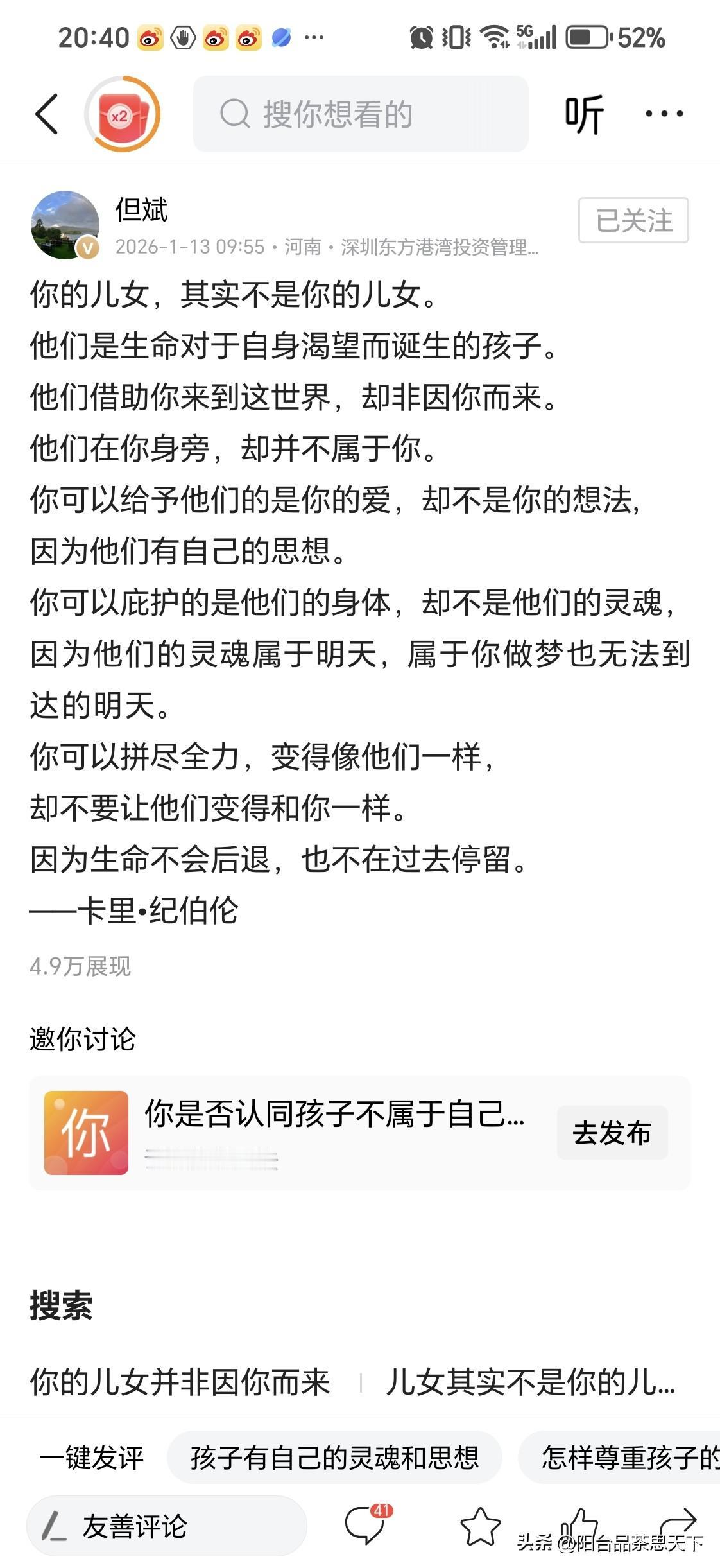 舆论的热点 著名投资人但斌转述了一首关于父母子女之间的诗歌!