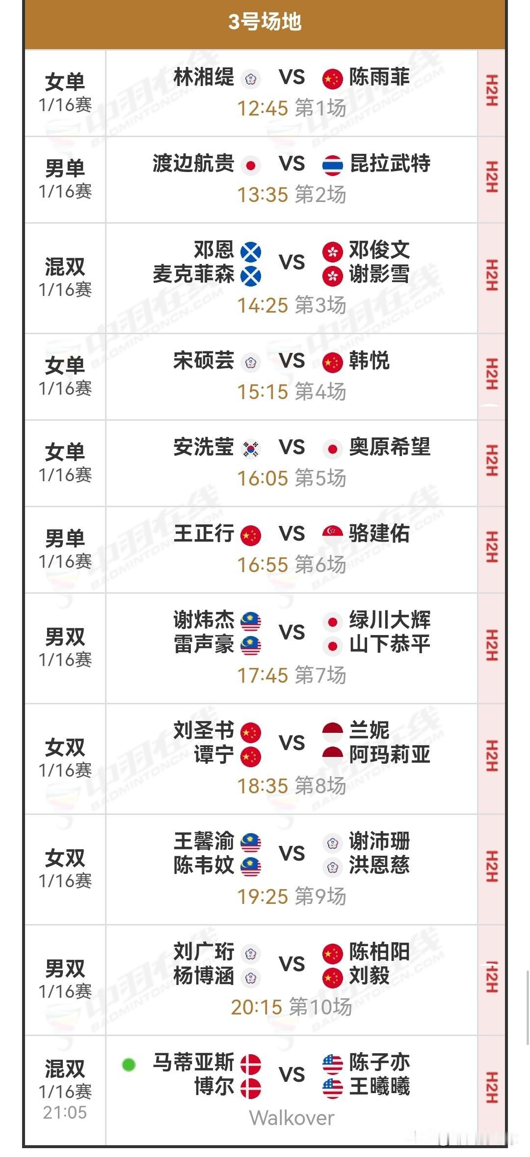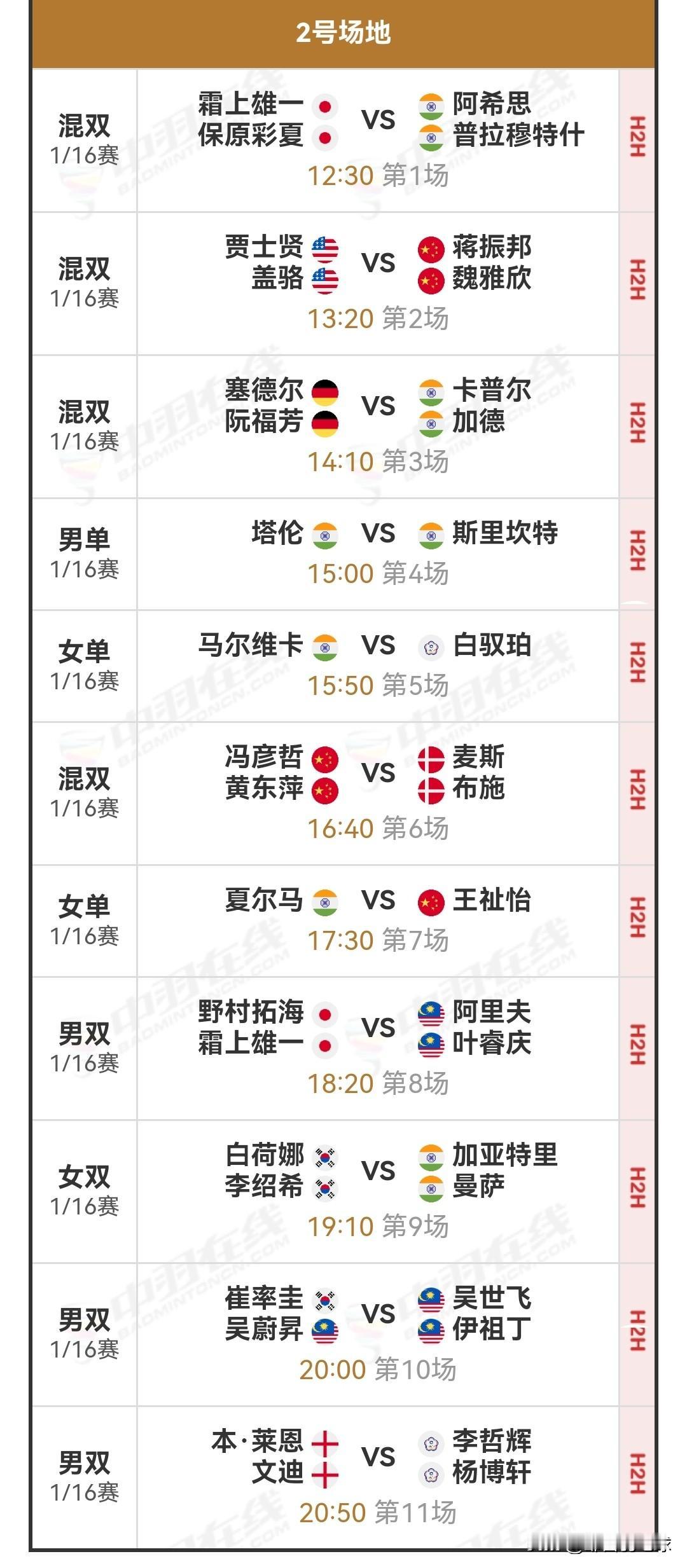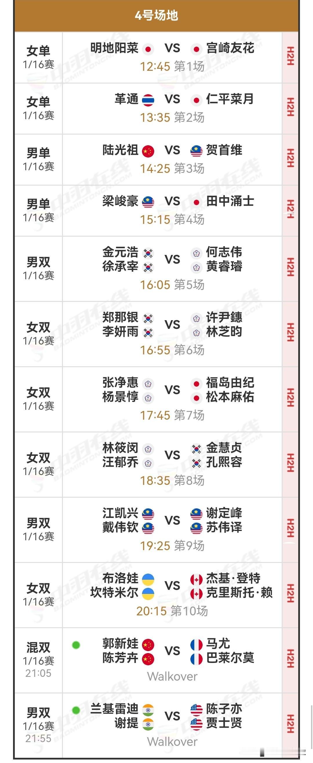 1月14日印度羽毛球公开赛1/16决赛(二)赛程安排 今日首日比赛中,国羽成绩为2胜1退赛。李怡婧/罗徐敏直落两局,横扫美国选手王曦曦/盖骆;梁王组合激战两局,险胜伦加德/麦斯,双双成功晋级下一轮。然而,高昉洁中途退赛,止步首轮。此外,李梓嘉苦战三局,不敌格姆克,复出后连续两站一轮游。 明日北京时间12:30,将进行1/16决赛(二),即首轮下半区的比赛。明日赛程包括陆光祖对阵贺首维、王正行对阵骆建佑、陈雨菲对阵林湘缇,星驰组合挑战陈堂杰/杜颐沩,同时凤凰组合、酱板鸭组合和圣谭组合也将登场。详细对阵安排如下: 羽球赛程 国羽赛程 羽毛球 羽毛球爱好者 羽毛球赛程 羽毛球赛事 羽毛球比赛 陈雨菲