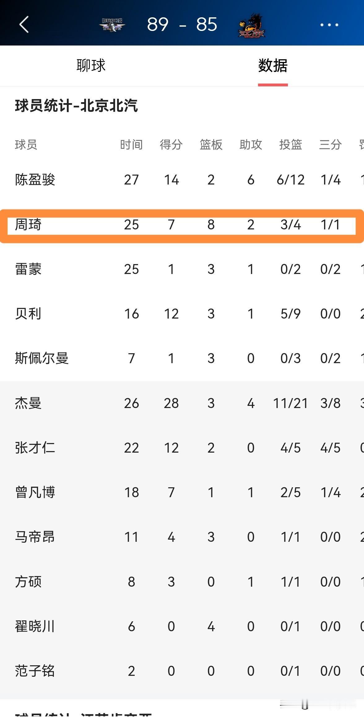 北京北汽超级中锋周琦真是太不喜欢得分了!在今天北京北汽主场以89:85险胜江苏肯帝亚的比赛中,周琦在进攻端的欲望并不强烈,全场比赛下来,周琦首发出战25分钟,仅仅出手4次得到7分8篮板2助攻,他的场上正负值为+6。 值得一提的是,本场比赛周琦作为一名中锋竟然0罚球,由此可见周琦在进攻端的侵略性是多么的弱,周琦真是太不喜欢得分了。