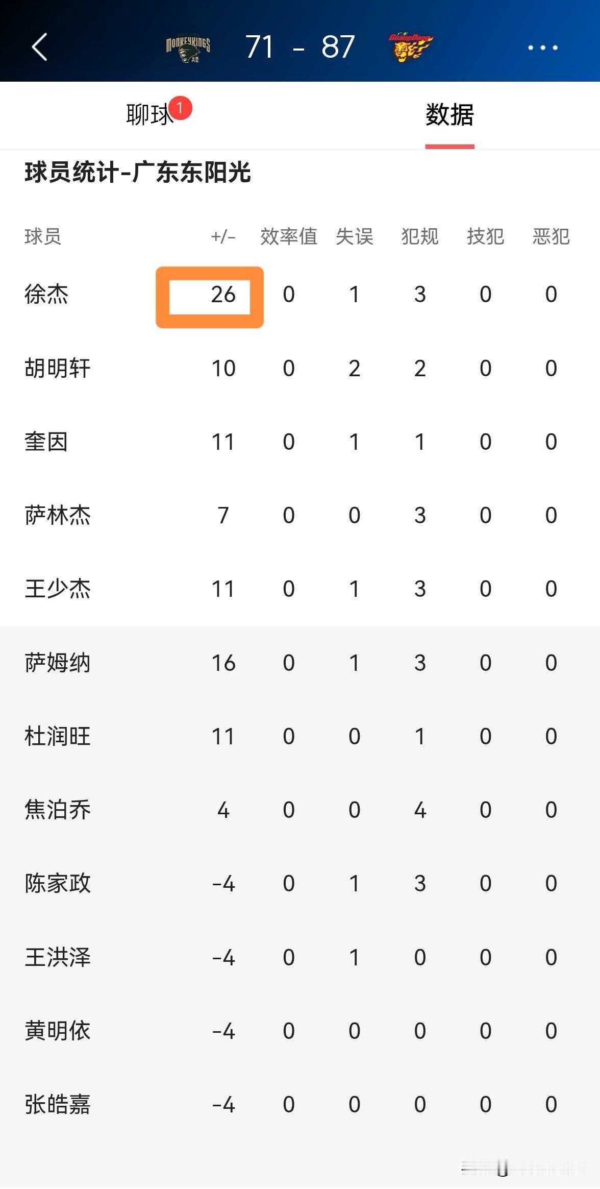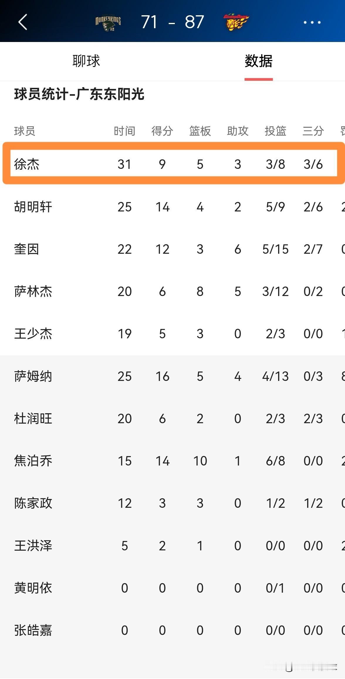 广东东阳光超级后卫徐杰真是太神奇了!在今天广东东阳光客场以87:71击败南京天之蓝的比赛中,徐杰首发出战31分钟,投篮8中3,其中三分球6中3仅仅得到9分,还有5篮板3助攻,他的场上正负值为全队最高的+26。 徐杰最神奇的地方在于,虽然他的得分并不高,但是他的场上正负值往往是球队最高的。对此,我苦思冥想了很久依然无法理解其中的道理,难道徐杰是天神下凡吗?