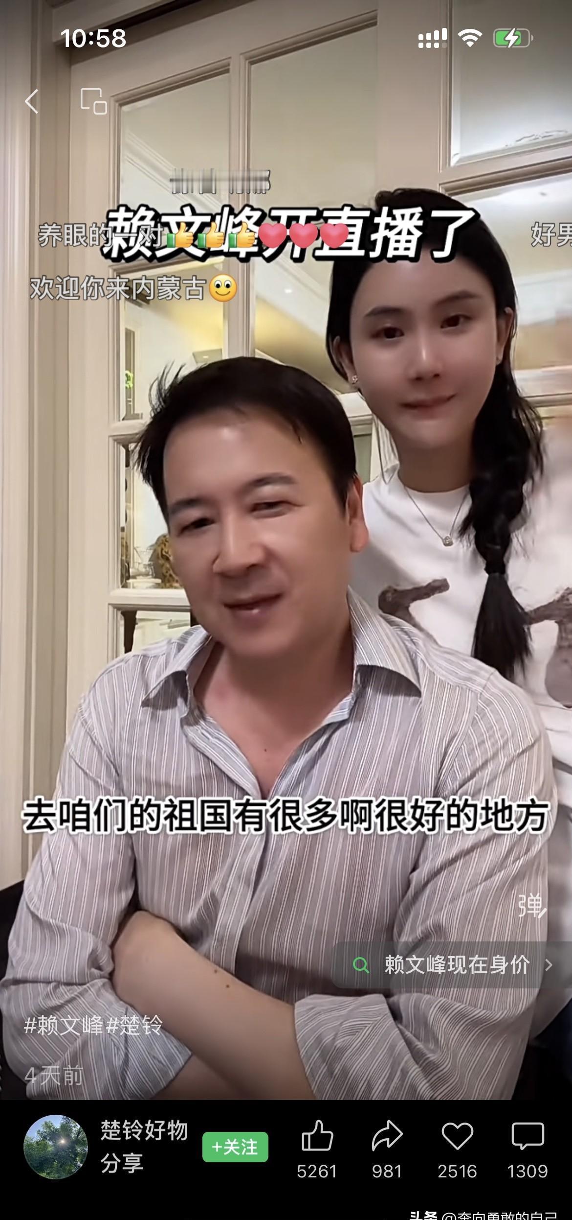 赖文峰回来了。 这次不是一个人,身边站着楚玲。 两人合开“峰玲传媒”,剑指直播带货。 他宣布要带粉丝旅行,看遍祖国山河。 这个切入点很聪明,文旅正是风口。 2023年直播电商规模冲到4.9万亿,文旅直播更是爆款频出。 从当年的情感风波,到如今的商业搭档。 他选了最稳妥的方式回归。 用风景淡化过往,用陪伴证明现状。 每一步都踩在流量密码上。 当年的爱恨情仇,和今天的商业版图,哪个才是成年人世界的终极答案?